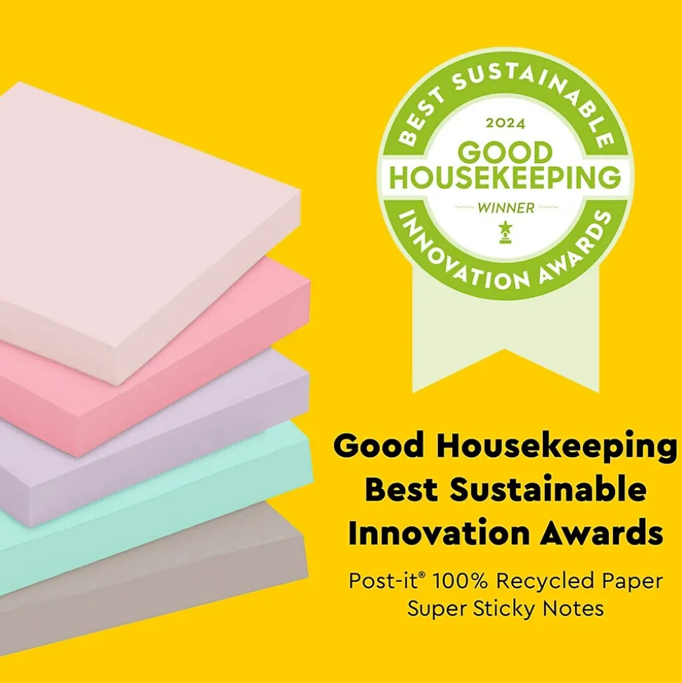 - GET ORGANIZED: Each pack includes 5 pads of 3 in. x 3 in. notes, with 70 sheets per pad, great for your office, work area, or classroom, these Post-it 100% Recycled Paper Super Sticky Notes are a 2024 Good Housekeeping Sustainable Innovation Awards Winner