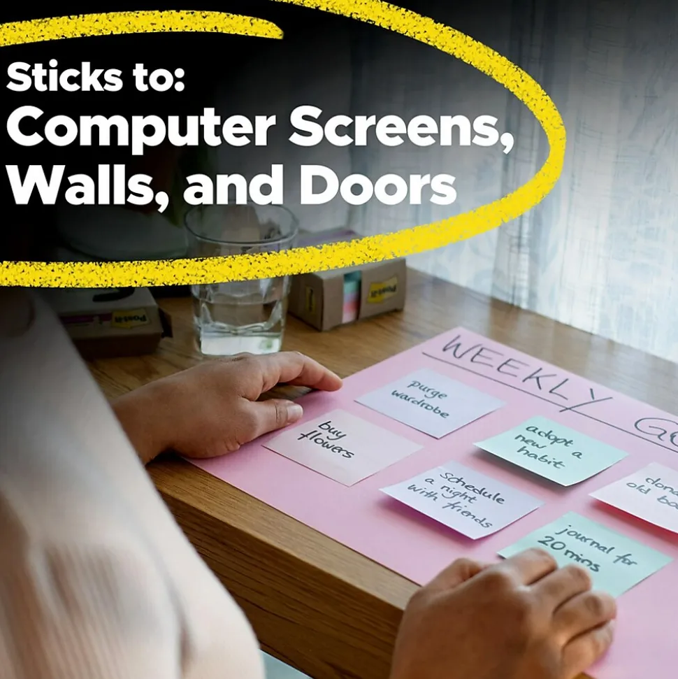 - STICK AND RESTICK ANYWHERE: These notes use water-based adhesive to stick firmly to walls, windows, doors, and other vertical surfaces, allowing you to move your reminders with ease