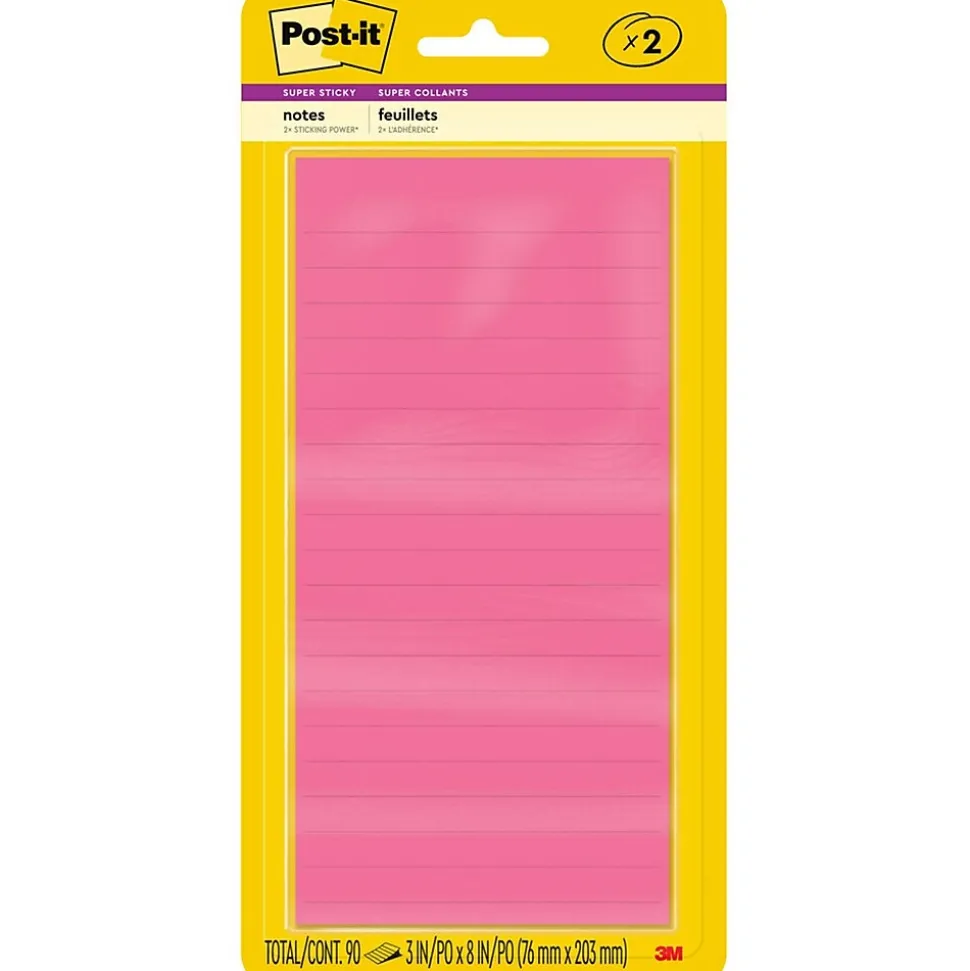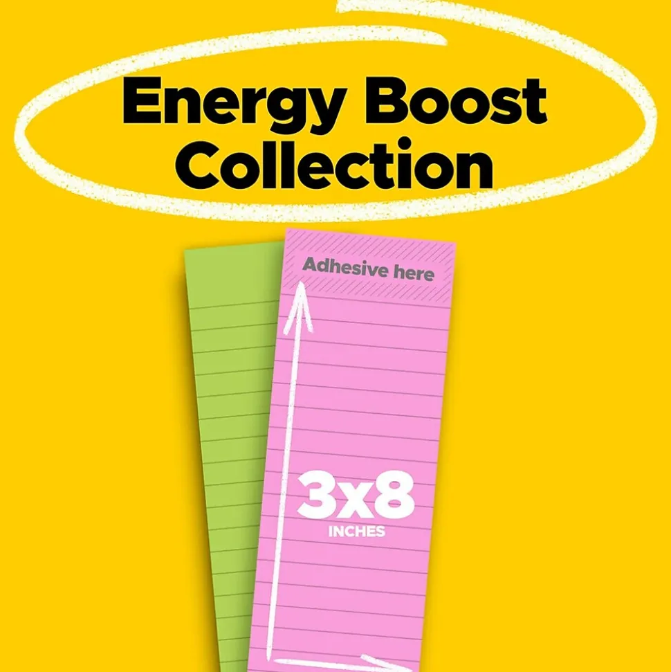 Uplift your spirits and messages via the vibrant, strong colors of the Energy Boost collection. Whether jotting down your daily to-do’s, brainstorming big ideas, studying or setting reminders, colors and ideas are always brighter together. These sticky notes feature 2X the sticking power. They also stick and re-stick – allowing you to move your notes with you throughout your day. They’re ideal for walls, doors, windows and other vertical surfaces, and like all Post-it Notes, they stick securely yet remove cleanly without damage. Keep your ideas across your notebooks, classroom books, calendars or other documents. No tape or tacks are needed with adhesive notes, saving you money and time on office products or school supplies. A great memo pad, these are ideal for using for notes or reminders to yourself or others. Post-it Super Sticky Notes are the perfect solution for shopping lists, reminders, notes on computer screens, time tracking, to-do lists, marking cables, color-coding documents, reminding kids to do chores, storyboarding, scratch paper and agile processing. This pack includes two pads of list lined notes that are 3 in. x 8 in. Both are 90 sheets per pad. These colorful sticky notes include colors from the Energy Boost collection including pink and green. All Post-it Notes are sourced from certified, renewable and responsibly managed forests, and all Post-it Notes are recyclable, so you can recycle them when they are no longer needed.