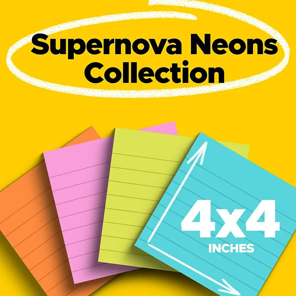 Ideas are out of this world with the electric colors of the Post-it Super Sticky Notes Supernova Neons Collection. Whether jotting down your daily to-do’s, brainstorming big ideas, studying or setting reminders, colors and ideas are always brighter together. These sticky notes feature 2X the sticking power. They also stick and re-stick – allowing you to move your notes with you throughout your day. They’re ideal for walls, doors, windows and other vertical surfaces, and like all Post-it Notes, they stick securely yet remove cleanly without damage. Keep your ideas across your notebooks, classroom books, calendars or other documents. No tape or tacks are needed with adhesive notes, saving you money and time on office products or school supplies. A great memo pad, these are ideal for using for notes or reminders to yourself or others. Post-it Super Sticky Notes are the perfect solution for shopping lists, reminders, notes on computer screens, time tracking, to-do lists, marking cables, color-coding documents, reminding kids to do chores, storyboarding, scratch paper and agile processing. Each notes sheet is approximately 4 in. x 4 in., with 45 sheets per pad and 4 sticky note pads per pack. These colorful sticky notes include colors from the Supernova Neons collection including pink, orange, lime and aqua. All Post-it Notes are sourced from certified, renewable and responsibly managed forests, and all Post-it Notes are recyclable, so you can recycle them when they are no longer needed.