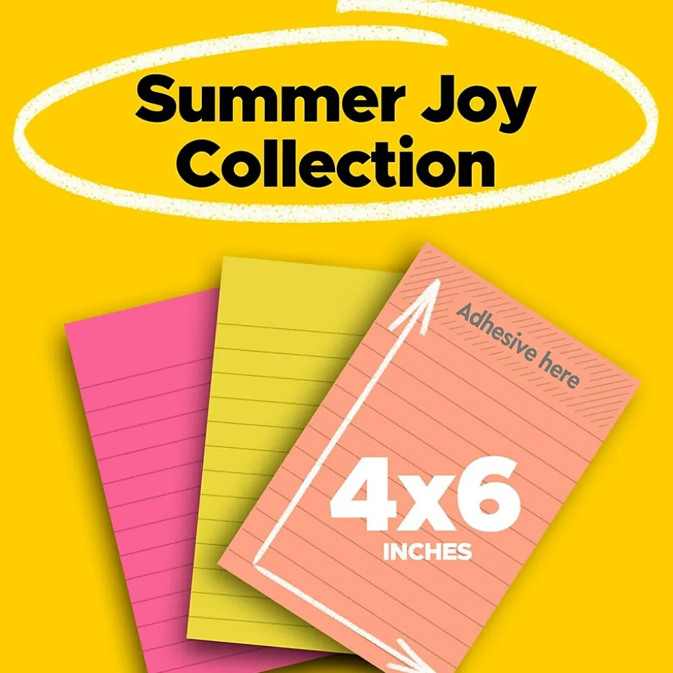 Share the warmth of the summer sunshine memories all year long with the Summer Joy collection. Whether jotting down your daily to-do’s, brainstorming big ideas, studying or setting reminders, colors and ideas are always brighter together. These sticky notes feature 2X the sticking power. They also stick and re-stick – allowing you to move your notes with you throughout your day. They’re ideal for walls, doors, windows and other vertical surfaces, and like all Post-it Notes, they stick securely yet remove cleanly without damage. Keep your ideas across your notebooks, classroom books, calendars or other documents. No tape or tacks are needed with adhesive notes, saving you money and time on office products or school supplies. A great memo pad, these are ideal for using for notes or reminders to yourself or others. Post-it Super Sticky Notes are the perfect solution for shopping lists, reminders, notes on computer screens, time tracking, to-do lists, marking cables, color-coding documents, reminding kids to do chores, storyboarding, scratch paper and agile processing. Each notes sheet is approximately 4 in. x 6 in., with 90 sheets per pad and 3 sticky note pads per pack. These colorful sticky notes include colors from the Summer Joy collection including yellow, coral pink and bright pink. All Post-it Notes are sourced from certified, renewable and responsibly managed forests, and all Post-it Notes are recyclable, so you can recycle them when they are no longer needed.