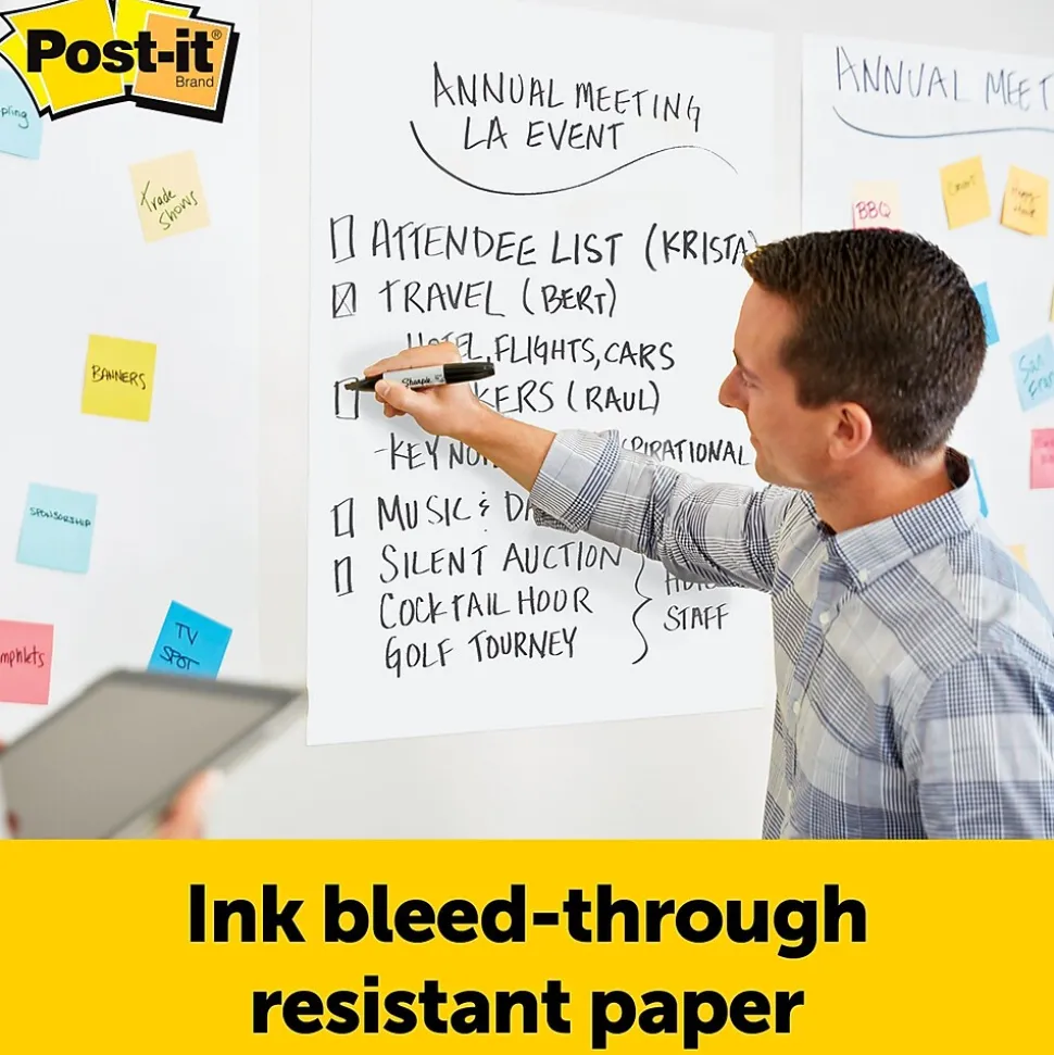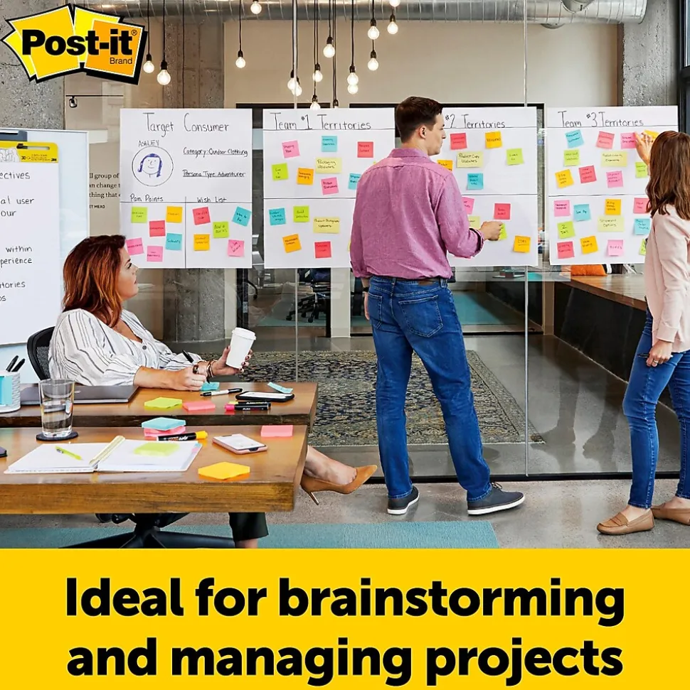 For over 30 years, consumers have trusted Post-it Brand Products. What began with Post-it Notes, used to remind and communicate, has grown to include Post-it Easel Pads used to capture and share ideas. With sheets that can stick almost anywhere, Post-it Easel Pads foster the imaginative thinking that lays the foundation for future growth. So when you want to successfully plan, collaborate, and capture and build on ideas, they’re ready to help you succeed. When floor space for an easel stand is limited use Post-it Wall Pads. Smaller and lighter than full size easel pads, they mount on walls, doors or windows with Command Strips. Turn any space into a temporary meeting space. The bright white sheets resists marker bleed through; they stick to most surfaces and can be repositioned again and again, without surface damage. Sheets are 20 inches wide x 23 inches long. There are 20 sheets per pad and two pads per pack.