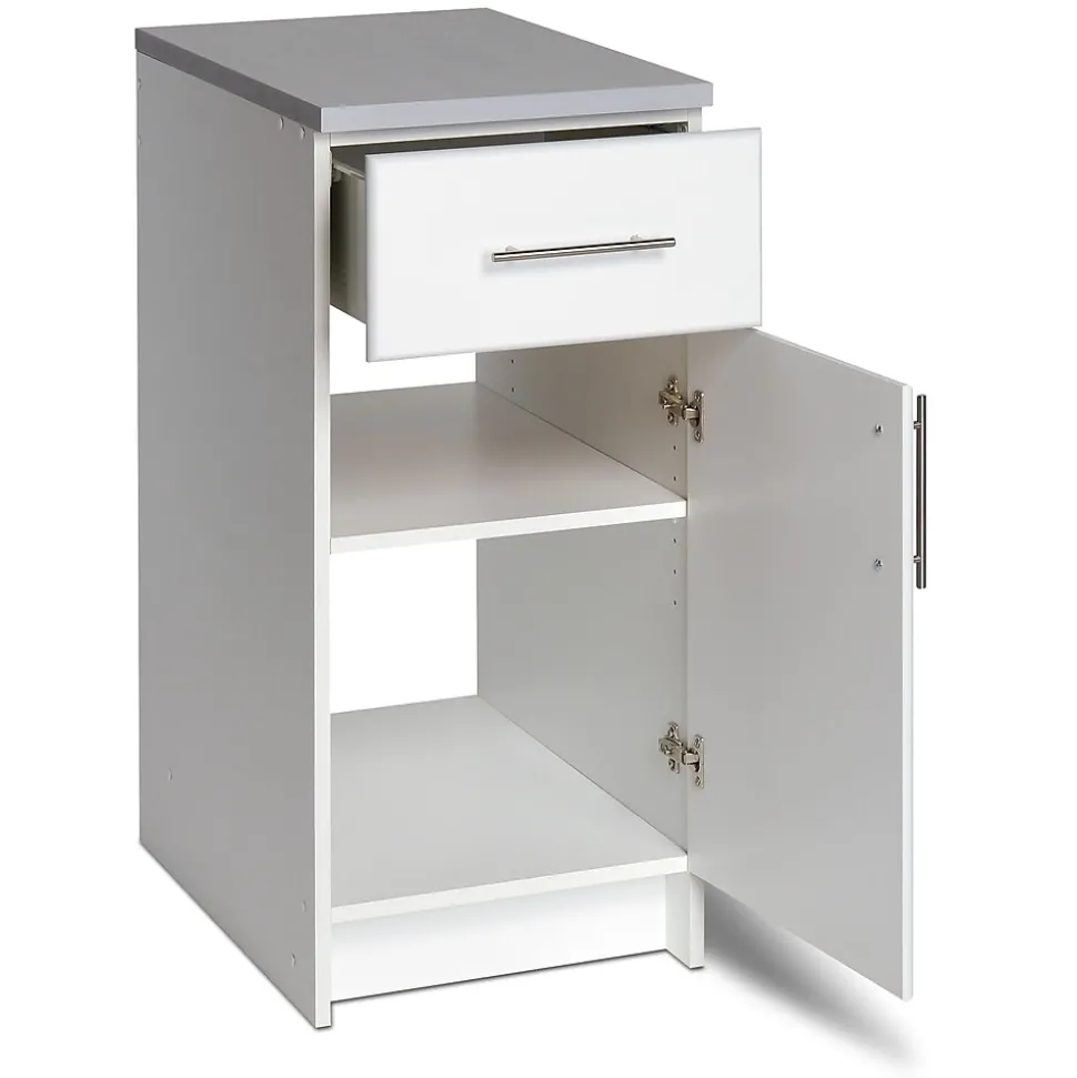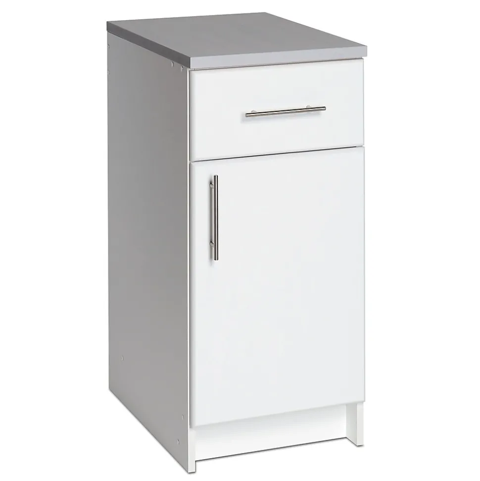 Prepac™ Elite 16″ base cabinet is constructed from CARB-compliant laminated composite woods. Cabinet has durable fresh white laminate finish with 1″ thick worktop with a durable melamine surface.