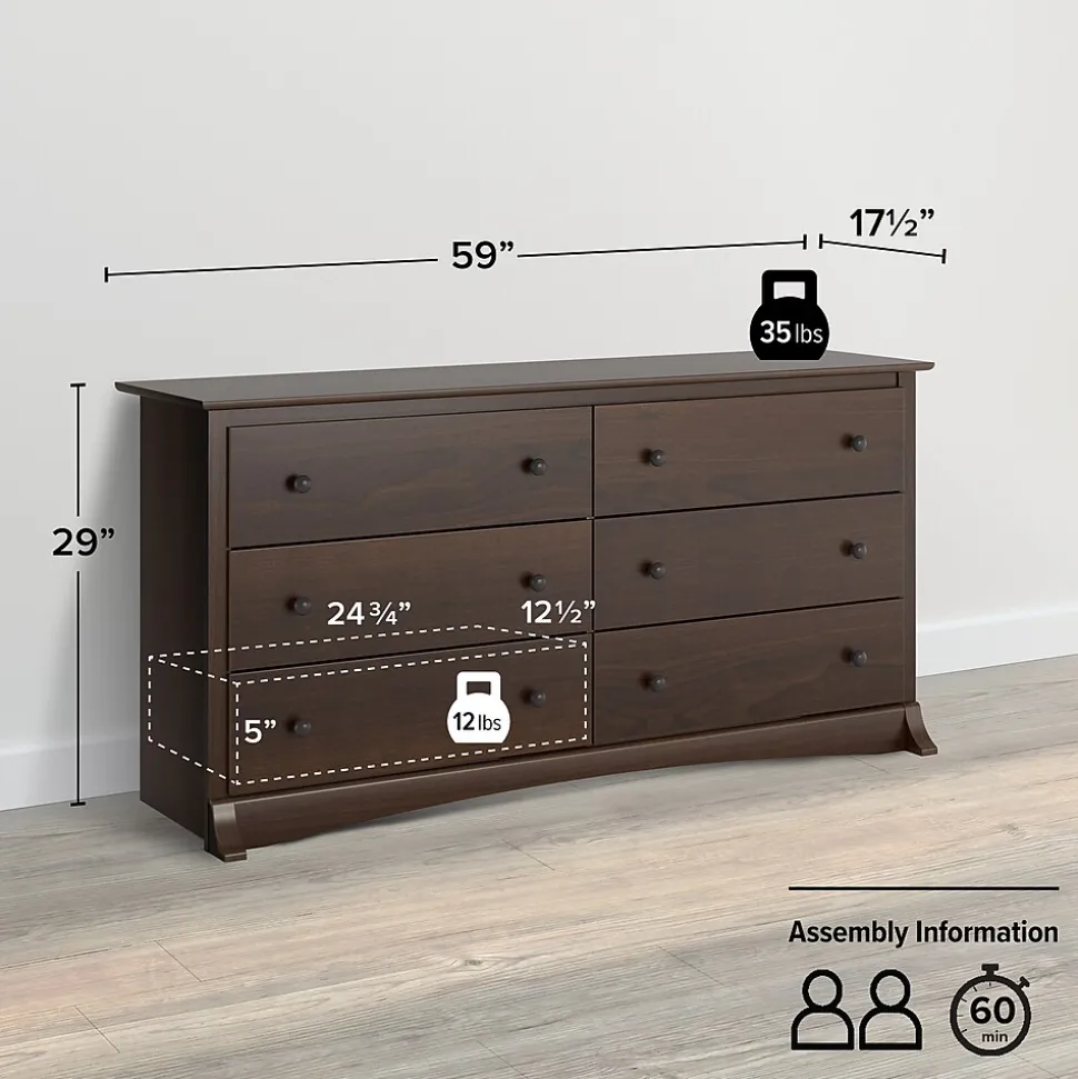Prepac 6-Drawer dresser in espresso finish is constructed from CARB-compliant laminated composite woods which give an elegant look to any room. Drawer dresser has a sturdy top to pile on your books, cell phone, alarm clock, lamp and more.