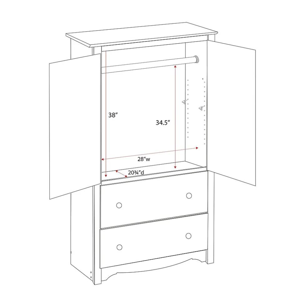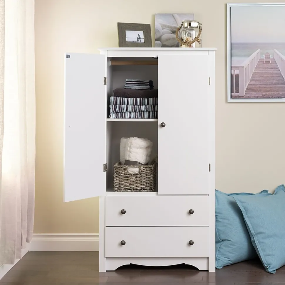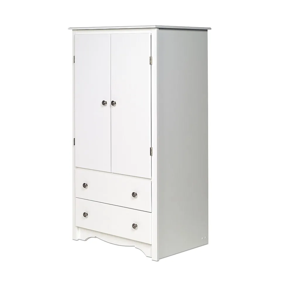 Prepac™ Monterey 2 door armoire in white finish is constructed from CARB-compliant laminated composite woods which give an elegant look to any room. Armoire has a sturdy top to pile on your books, cell phone, alarm clock, lamp and more.