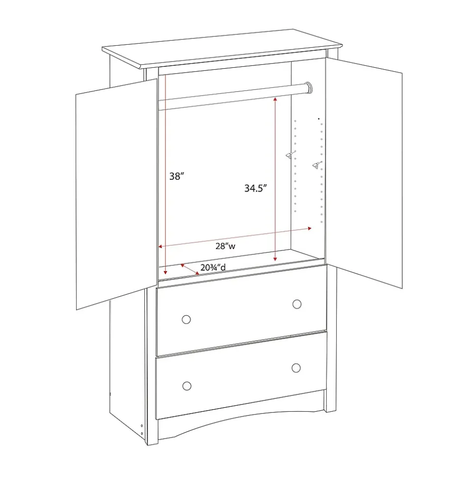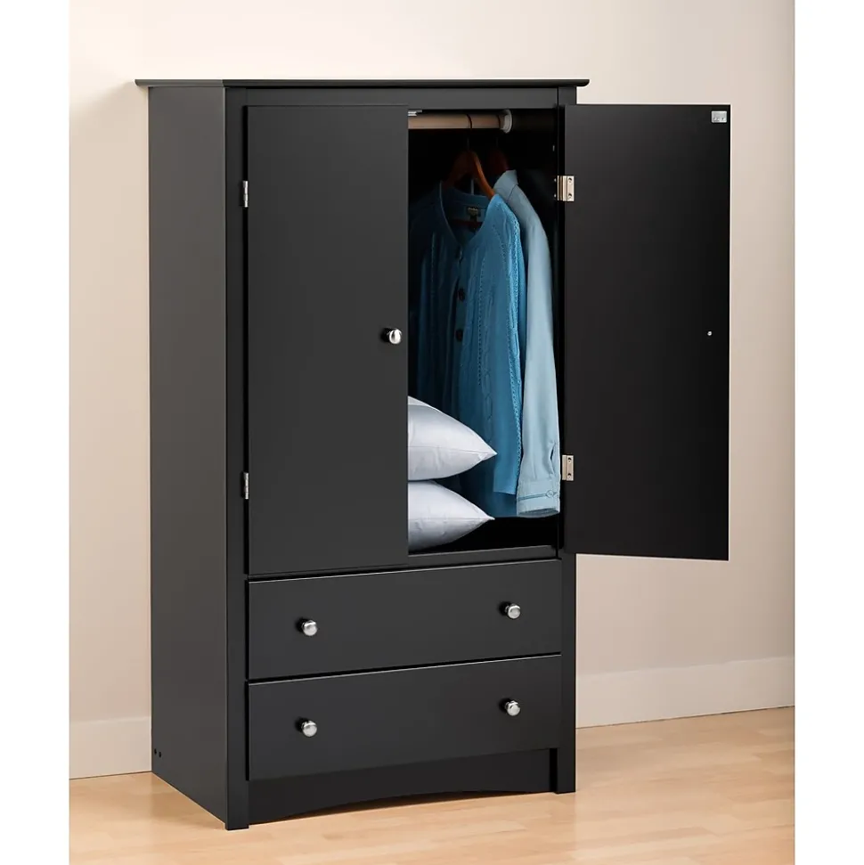 Prepac™ 2 Door armoire in black finish is constructed from CARB-compliant laminated composite woods which give an elegant look to any room. Drawer chest has a sturdy top to pile on your books, cell phone, alarm clock, lamp and more.
