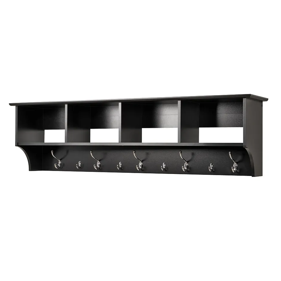 Prepac™ 60″ Hanging entryway shelf in black finish helps keep your gloves, hats, coats and jackets organized. Shelf easily mounts to wall with its innovative 60″ Hanging rail system providing a sleek and traditional look.