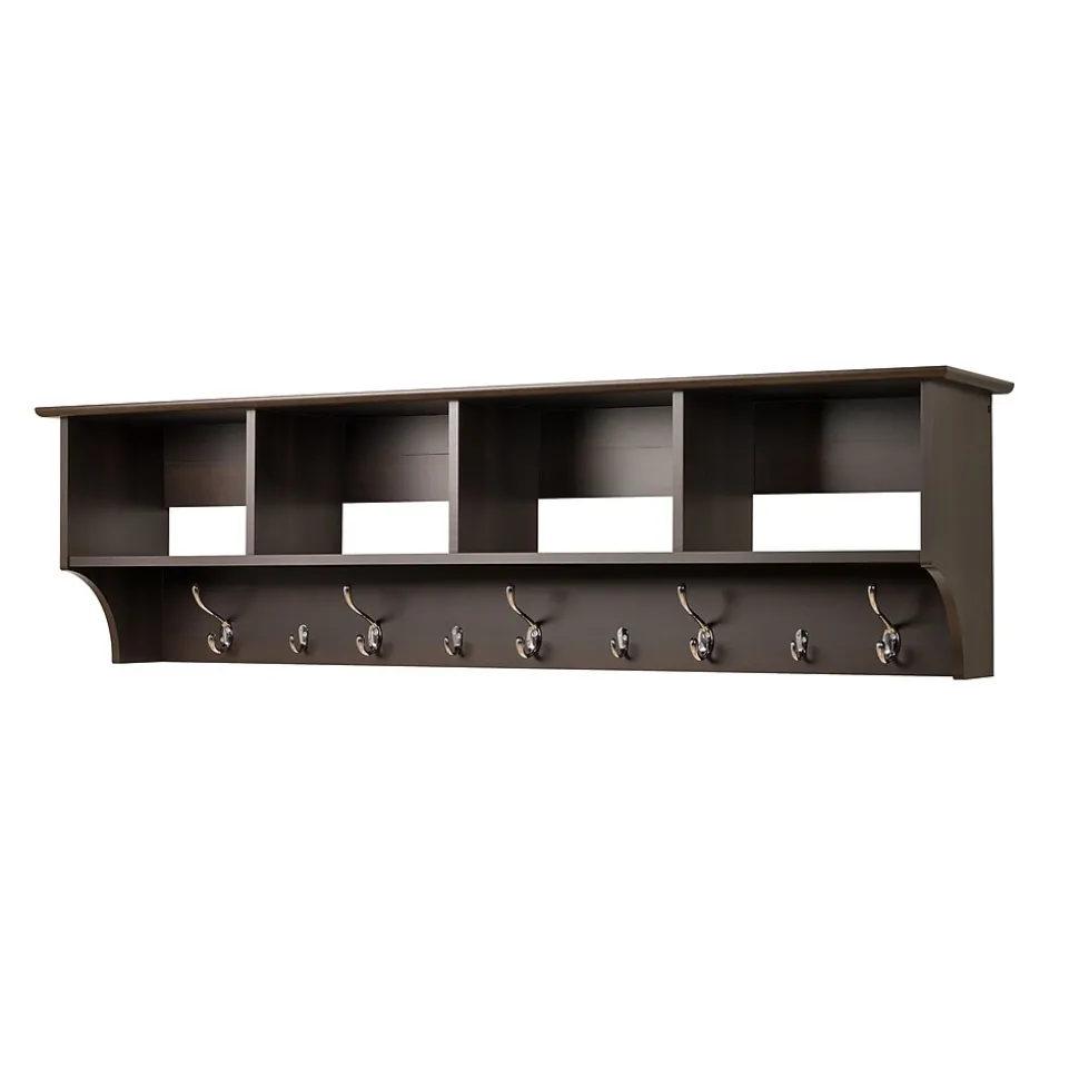 Prepac™ 60″ Hanging entryway shelf in espresso finish helps keep your gloves, hats, coats and jackets organized. Shelf easily mounts to wall with its innovative 60″ Hanging rail system providing a sleek and traditional look.