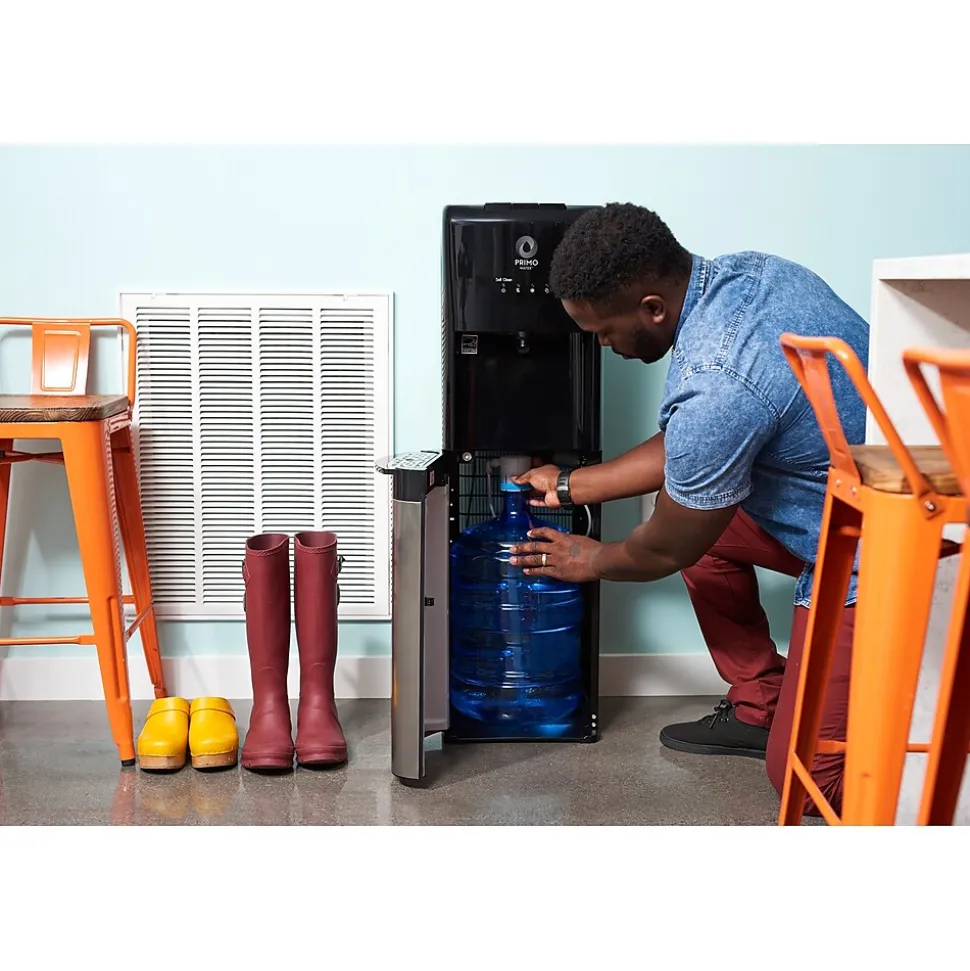 The Primo Water Deluxe Bottom Loading water dispenser is designed to simplify your hydration experience. With convenient bottle storage inside the cabinet, lifting, flipping, and spills are a thing of the past, ensuring a mess-free setup. Stay ahead with our empty bottle indicator, alerting you when it’s time for a refill, guaranteeing you always have refreshing water on hand. Crafted with stylish black and stainless steel accents, this dispenser seamlessly integrates into any room’s decor while providing durability and longevity. Enjoy peace of mind with built-in safety features like a child safety latch and night light, perfect for families. Plus, with fast-flowing cold, room temp, and hot water options and stainless steel hot and cold tanks, our dispenser delivers instant refreshment and convenience.