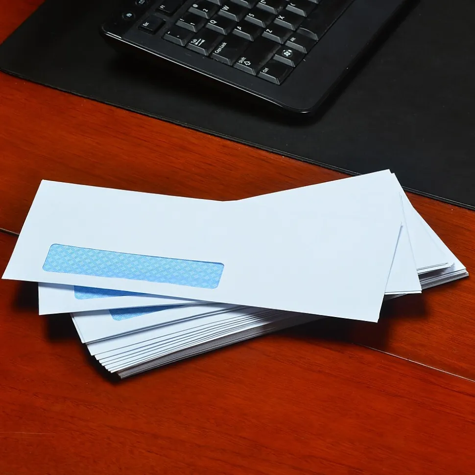 #10 window security tinted business envelopes for standard mailing. Your business is too important to leave the details up to chance. Quality Park offers you many options for your mailing and shipping needs. These envelopes feature fully gummed flaps and provide a secure seal. 24 lb. bright white stock and contemporary side seams give mailings a professional look. Our blue security tint keeps contents confidential while in the mail stream. Purchasing envelopes will be at a minimum with the convenient 500 count giving you more time to concentrate on business. Quality Park envelopes are the obvious choice for your business. See our array of other envelope options to fit your business’s needs!
