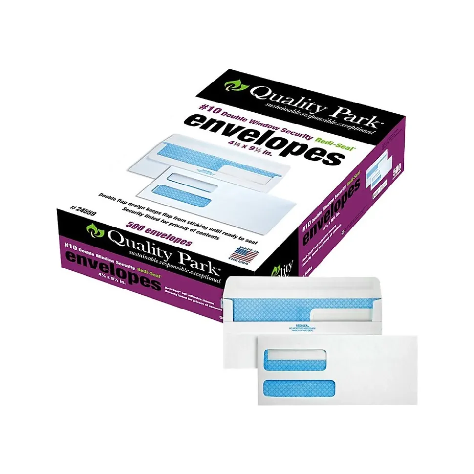 Mail confidential documents with confidence by using these security-tint envelopes. With a convenient Redi-Seal closure, these envelopes require no moisture to seal, letting you take on large mailing tasks quickly. These Quality Park Redi-Seal double-window #10 envelopes are made from a bright white stock and have two windows, so you can conceal sensitive information easily.