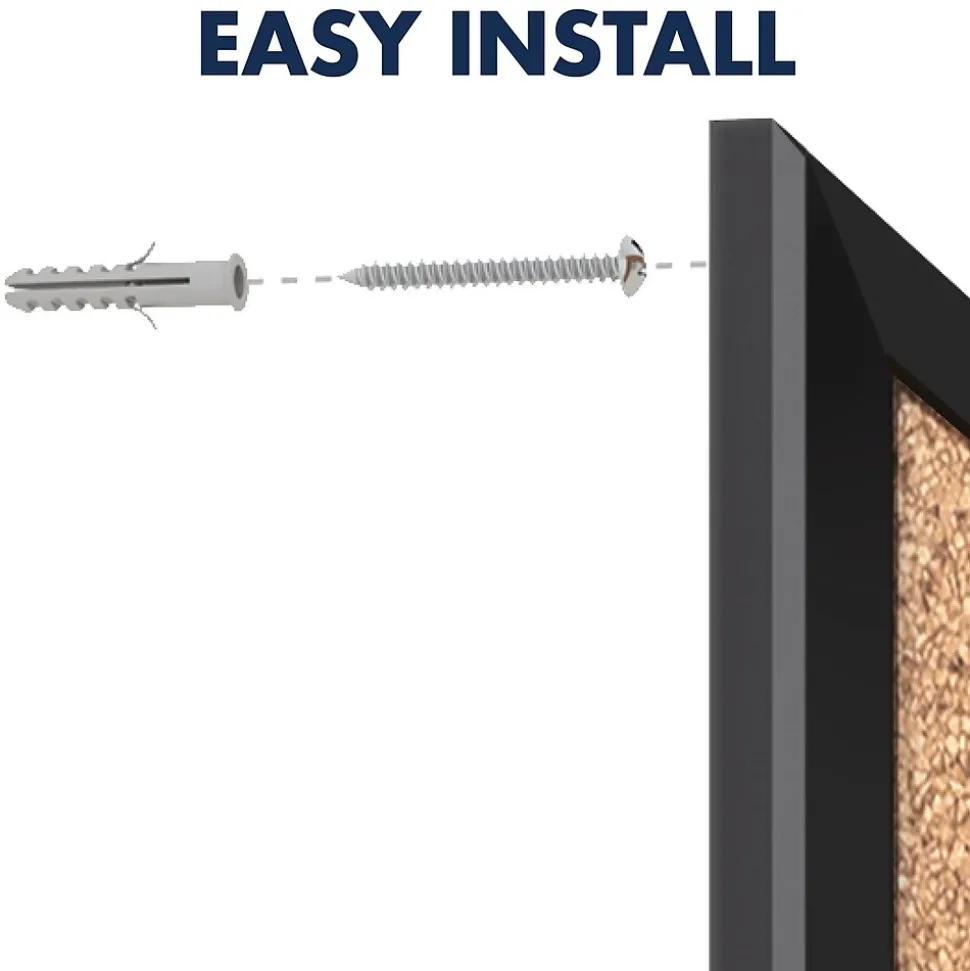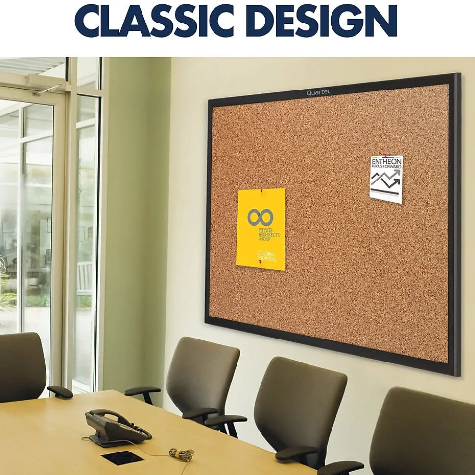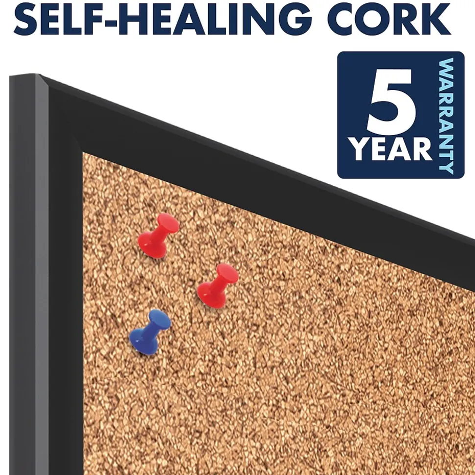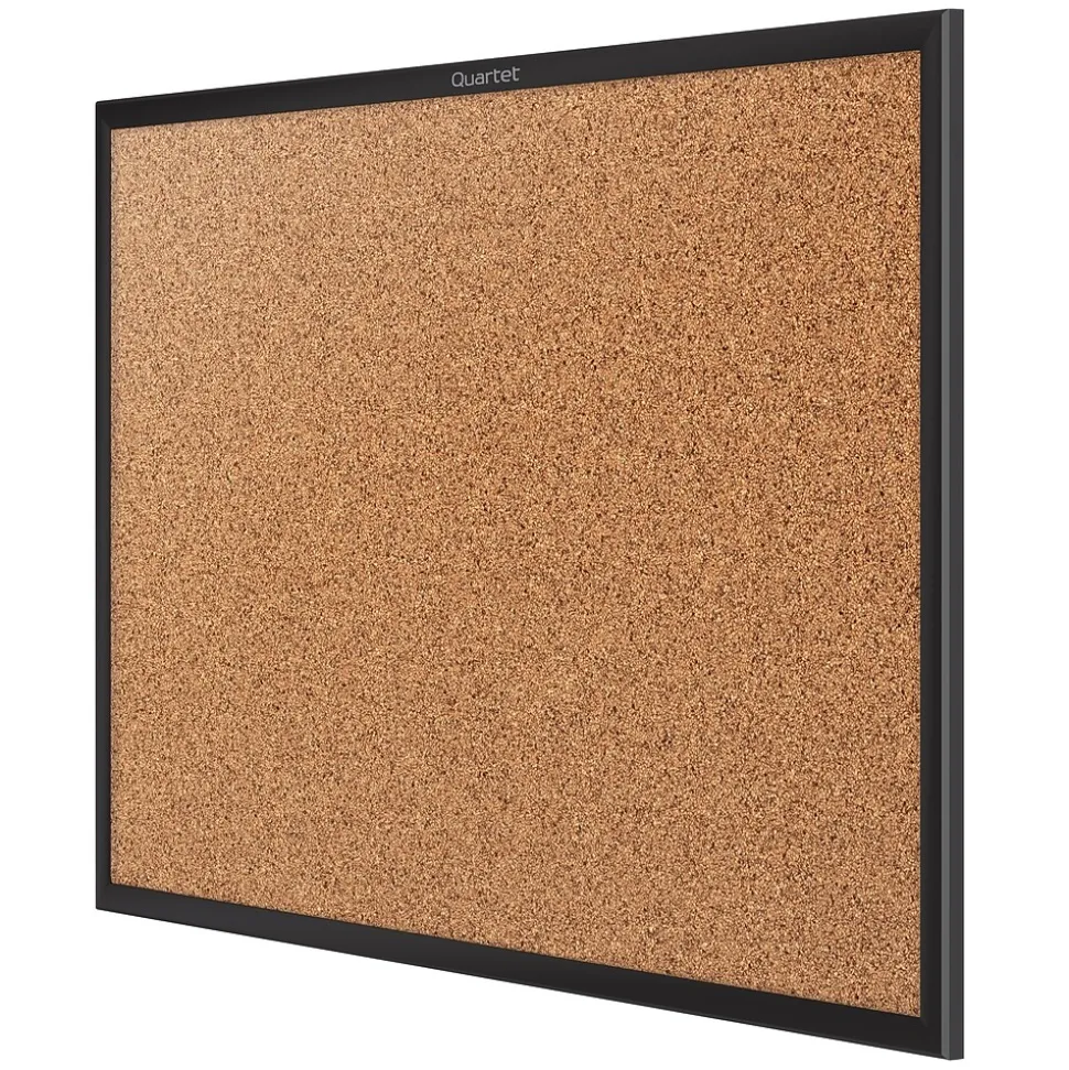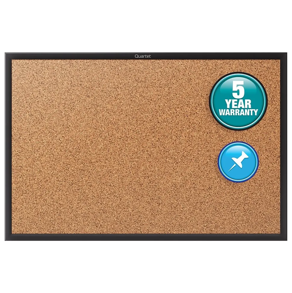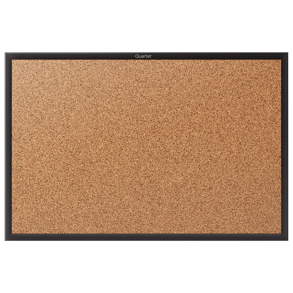 Outfit your office, cubicle or break room with this Quartet cork bulletin board. Self-healing cork provides long-lasting durability, while the black-finish aluminum frame adds a professional touch. The included mounting hardware allows for fast, easy installation. With a durable backing, this Quartet cork bulletin board holds pins securely so your notes and memos stay neatly in place.