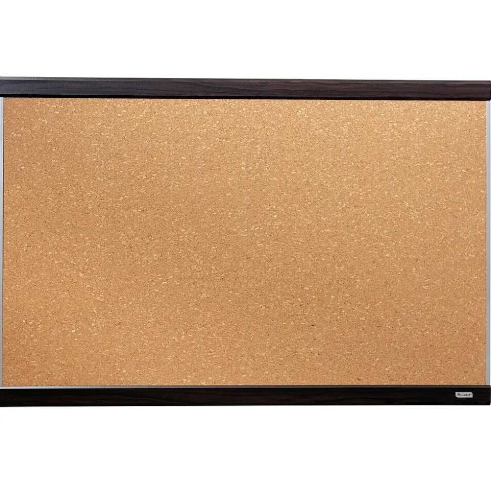 Quartet® Cork bulletin board in mahogany finish with aluminum frame includes easy to use mounting system for accurate horizontal/vertical installation. Natural cork bulletin board surface holds pinned items securely.