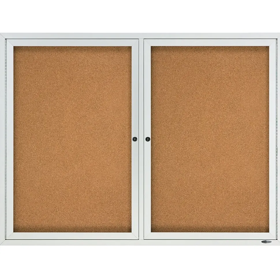 Reach desired audiences by presenting newsletters, announcements, and pictures on this enclosed cork bulletin board. Two locking, swinging doors and shatterproof tempered glass enclose this bulletin board, keeping publications safe and secure. The self-healing cork and aluminum casing on this bulletin board offer long-lasting durability. This Quartet cork bulletin board has a vented frame to keep moisture at bay, allowing for clear viewing.