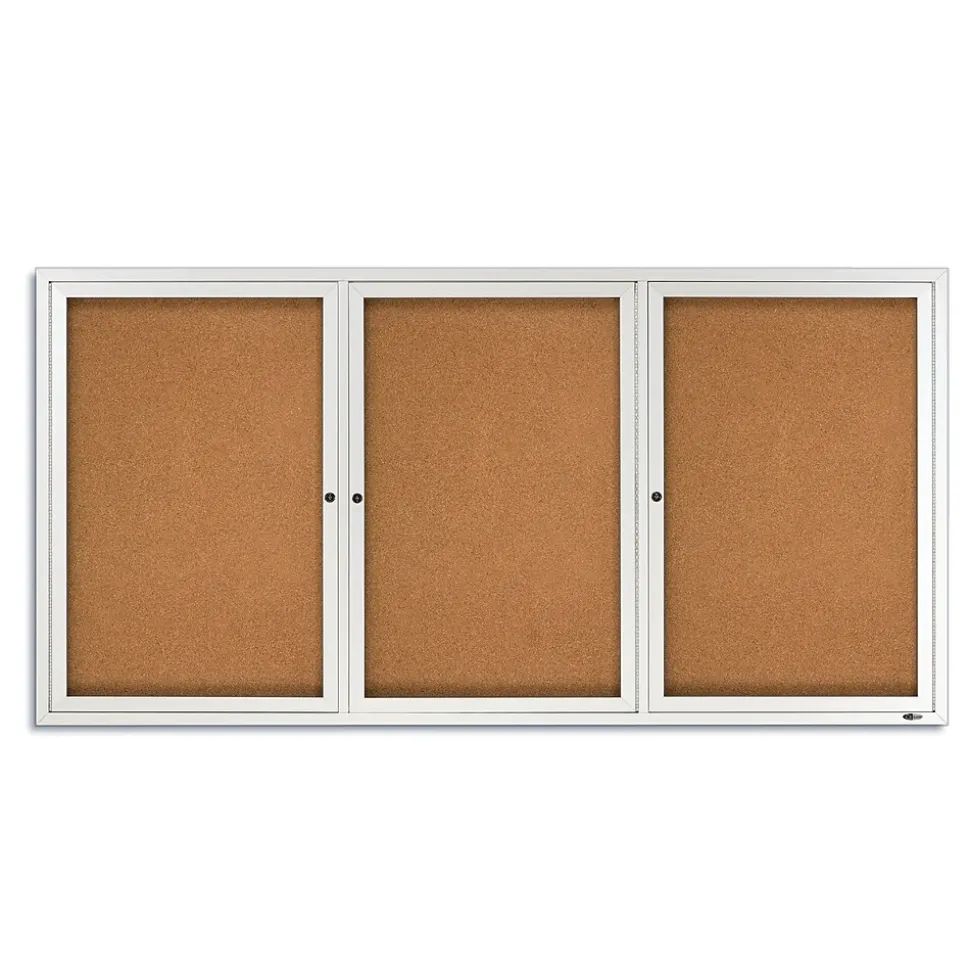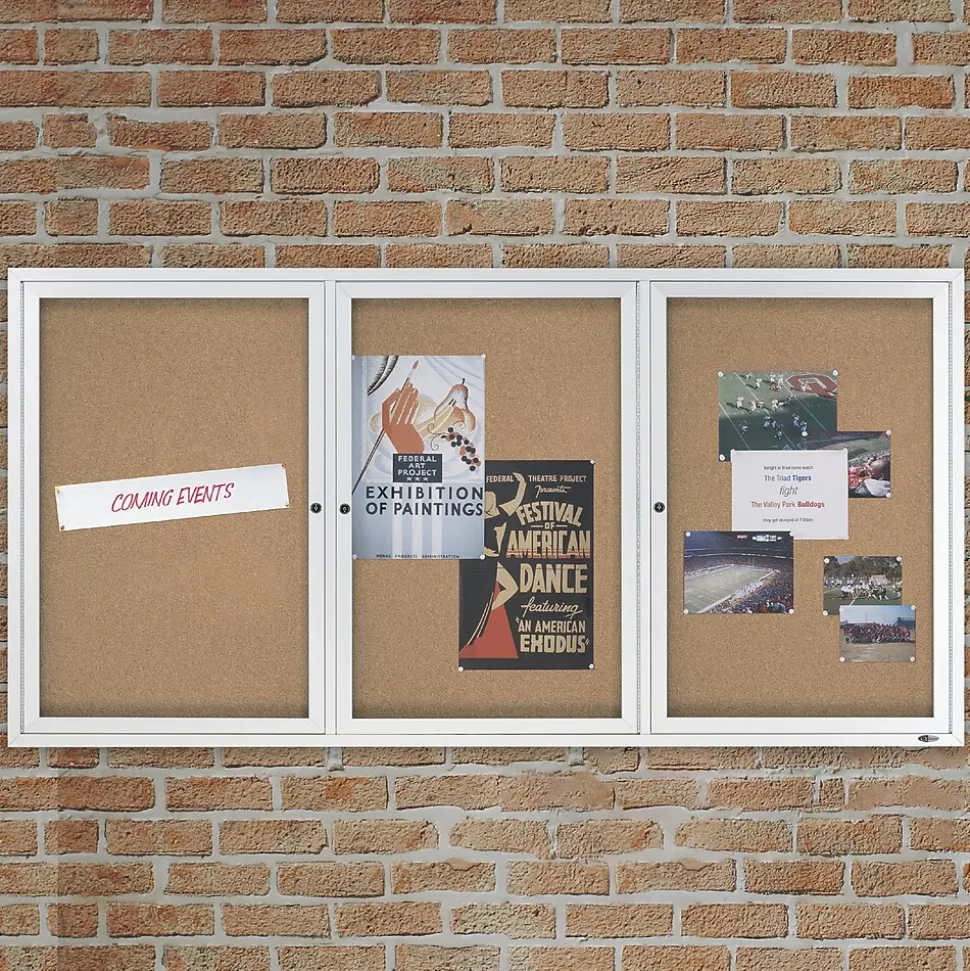 Protect signs with this bulletin board with lockable hinged doors. It’s natural cork surface is strong enough to withstand repeated posting, and aluminum-framed doors have full-length hinges that let them pivot completely, making it easy to post or change notices. The windows on this Quartet enclosed bulletin board are shatterproof, protecting its contents from potential vandalism.