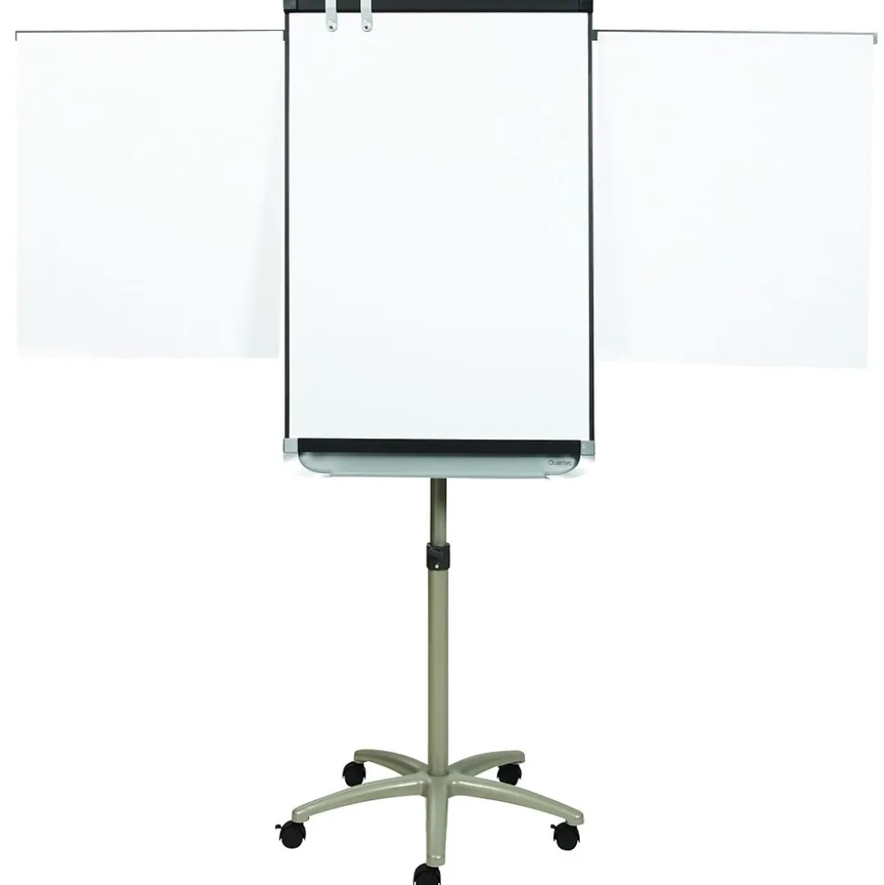 Mobile presentation easel has a magnetic Total Erase® whiteboard surface that doubles as a magnetic bulletin board, and includes a flipchart holder. Roll and relocate easel on 5-caster base with Prestige 2 Connects™ accessories attached. Easel adjusts from 67” to 77” tall. 15 year warranty.