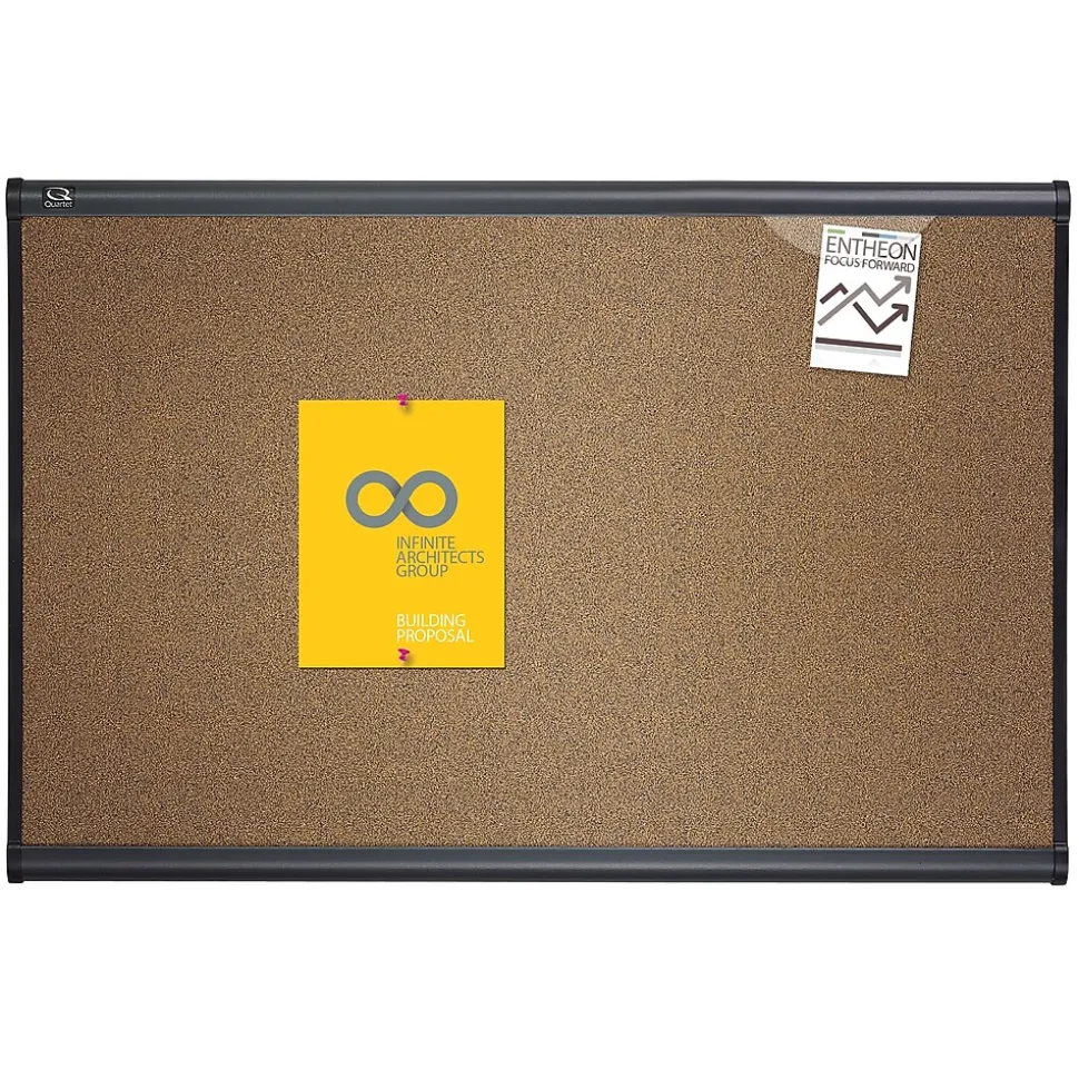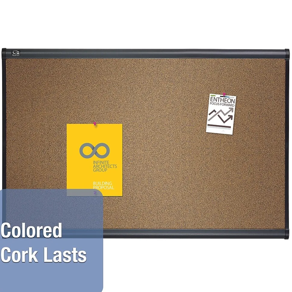 Display documentation and memos by using this colored cork bulletin board. The light cherry finish border on this board has graphite sides for protection from drops. This Quartet Prestige bulletin board has a Easy Mount hanging system so assembly and installation is easy.
