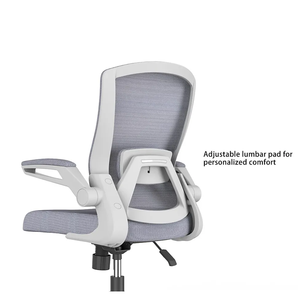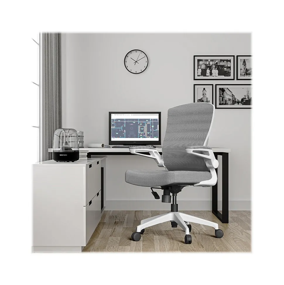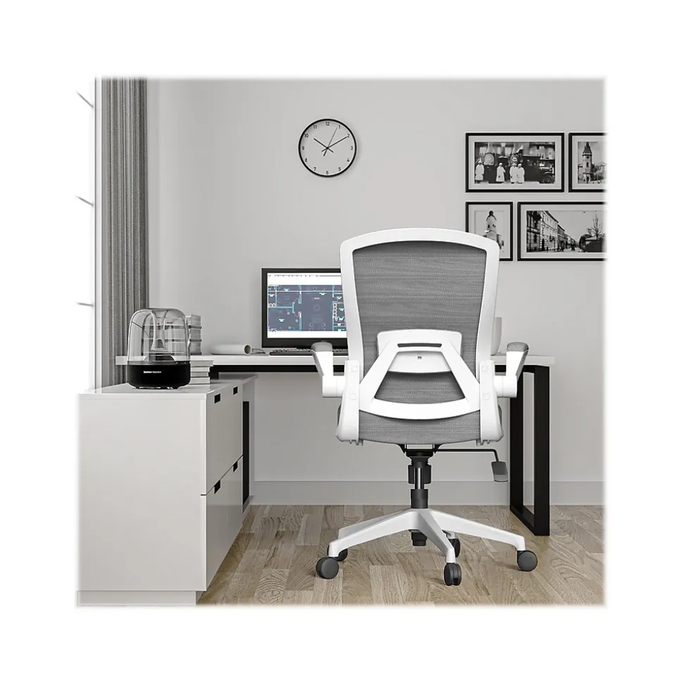 - Durable white nylon frame with a mesh back and seat covered in gray fabric