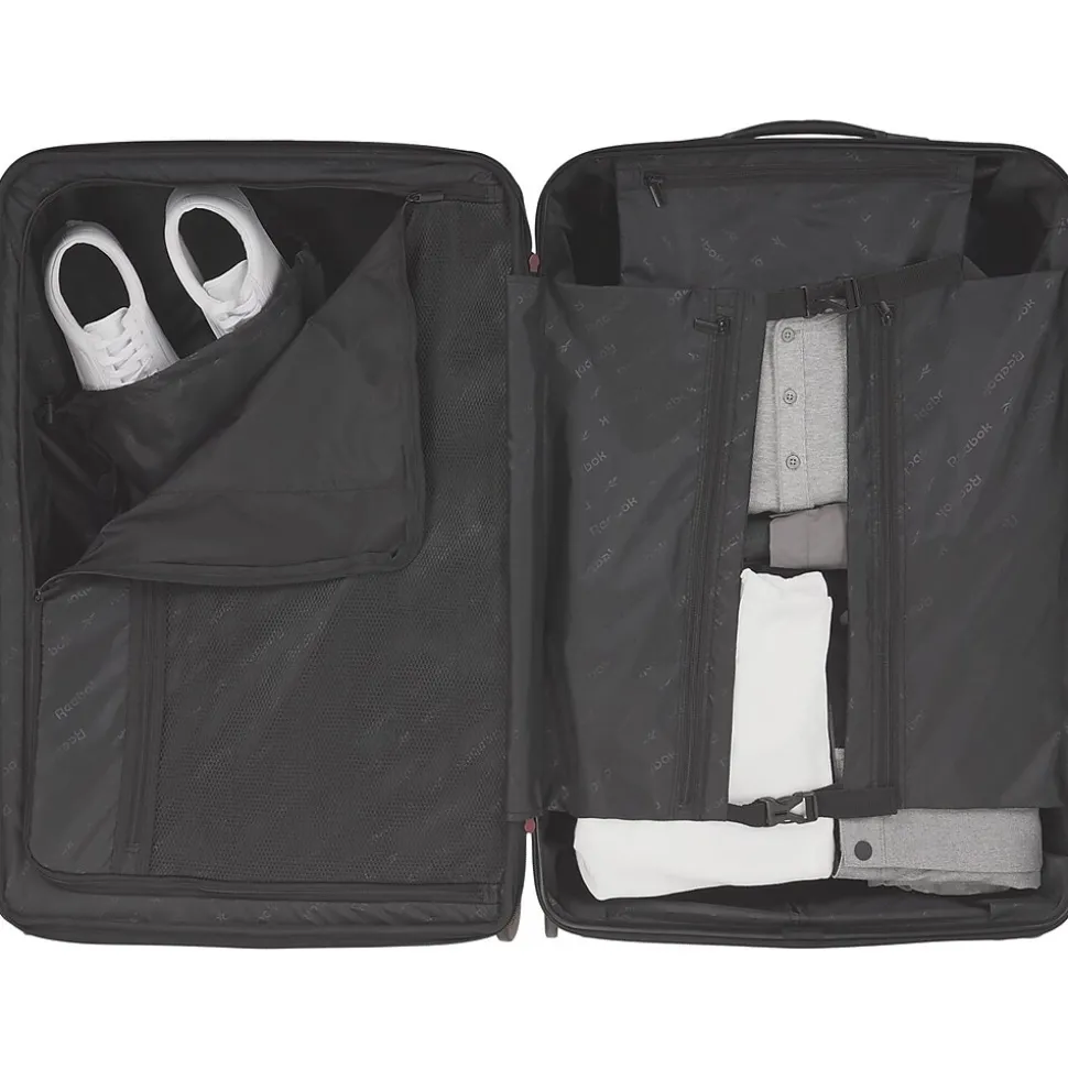 Introducing the Reebok Commitment carry-on luggage: your ultimate travel companion. Travel in style and convenience with this lightweight and resistant polycarbonate carry-on. Built to withstand the rigors of travel, the suitcase’s shock-resistant hard shell ensures your belongings stay safe and secure throughout your journey. With a TSA lock, you can rest easy knowing your valuables are protected. The side handle allows for effortless lifting, even when dealing with heavy loads. And thanks to the smooth retractable handle, navigating crowded airports has never been easier. Four double spinner wheels (eight wheels in total) glide effortlessly in any direction, ensuring smooth and stable maneuvering. Say goodbye to awkwardly dragging your luggage around. Need more space? The expansion system allows for a 20% increase in capacity, giving you the flexibility to pack more without worry. Inside, you’ll find a spacious interior, perfect for organizing your essentials and keeping them within easy reach. Whether you’re a frequent flyer or an occasional traveler, the Reebok Commitment carry-on suitcase is designed to meet your every need. So why settle for anything less? Upgrade your travel experience today.