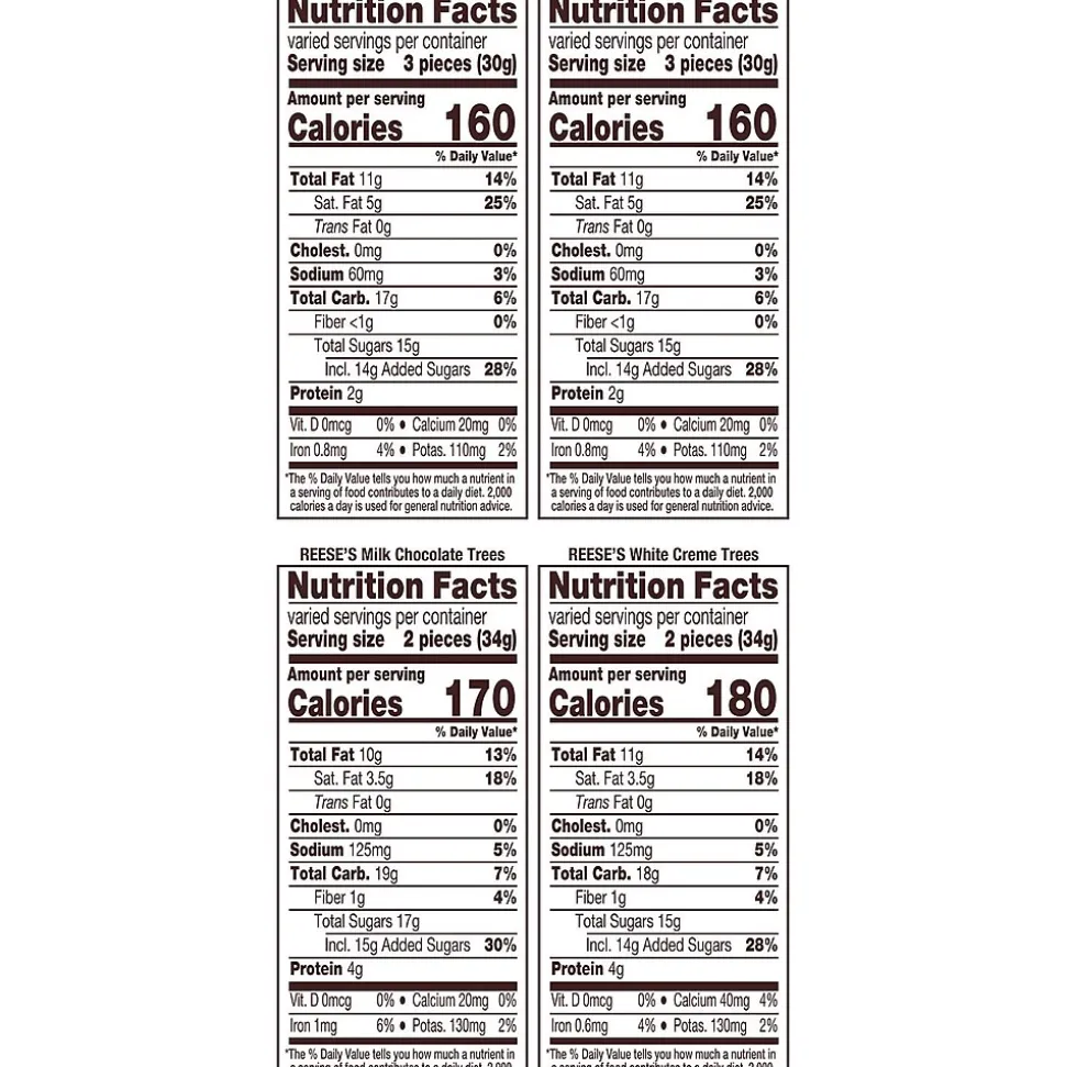 - Includes REESE’S milk chocolate peanut butter trees candy, REESE’S white creme peanut butter trees candy, REESE’S chocolate peanut butter nutcrackers candy and REESE’S chocolate peanut butter mini bells candy