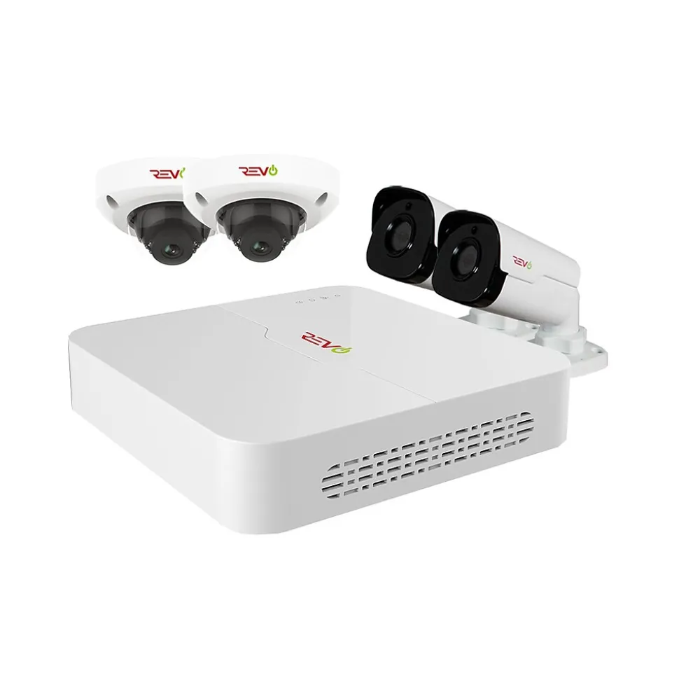 The “RU82D2GB2GA-2T” is a complete plug and play HD surveillance system with 8 CH 4K NVR, 2 TB & 4x 4 HD Indoor/outdoor Audio Capable Cameras. The REVO ULTRA NVR is powerful featuring state of the art H.265 Compression, up to 4K Recording and 4K video output.The H.265 Cameras feature massive 2K Sensors, double the resolution of standard 1080p and are equipped with a built-in microphone for audio streaming and recording. The cameras are built for the outdoors capable of handling temperatures as hot as 140F and as cold as -40F. The “RUCD28-1” dome camera features a 2.8mm fixed lens for super wide field of view coverage. It also comes equipped with 18 IR LEDs that will illuminate the scene up to 75’ in total darkness. The “RUCB36-1A” Bullet Camera features IR anti reflection glass and a 3.6mm fixed lens for a wide field of view coverage. The built-in Professional Grade “OSRAM” LEDs strongly illuminate the scene up to an unprecedented 100’ in total darkness.The polished look and intuitive feel of the Ultra’s interface is a joy for everyday use whether you’re using the NVR itself, the Mobile App, Computer Software or Browser.