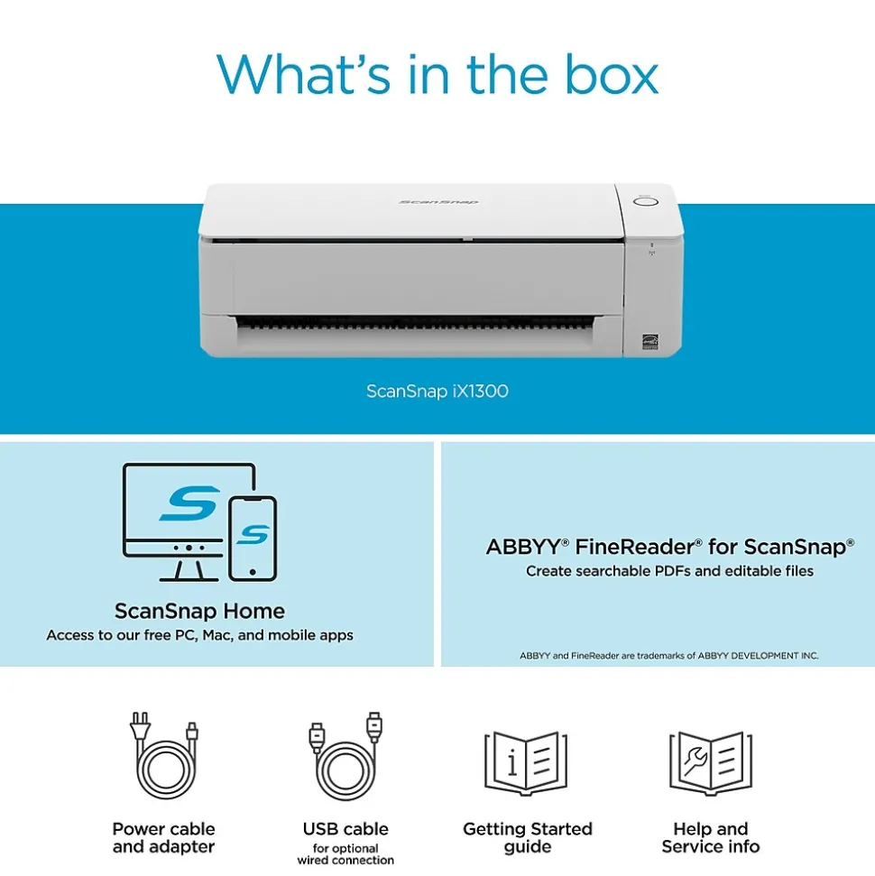 Incredibly compact, the RICOH ScanSnap iX1300 features an innovative design that was built to empower users with faster, more convenient, Wi-Fi enabled scanning in an even smaller operating footprint. The model offers two scanning modes that offer a quicker and more efficient way to scan, while also supporting a wider range of document types and needs without taking up space on your desk, enabling work in virtually any environment. The ScanSnap iX1300 was made to fit just about anywhere, from your entryway to the corner nook of your home office, offering an incredibly small operating footprint. And, thanks to its Wi-Fi capabilities, the ScanSnap iX1300 can scan from just about anywhere you have a power outlet, allowing you to easily place the device right at the point of entry for paperwork, mail, or other documents that enter your home or business.
