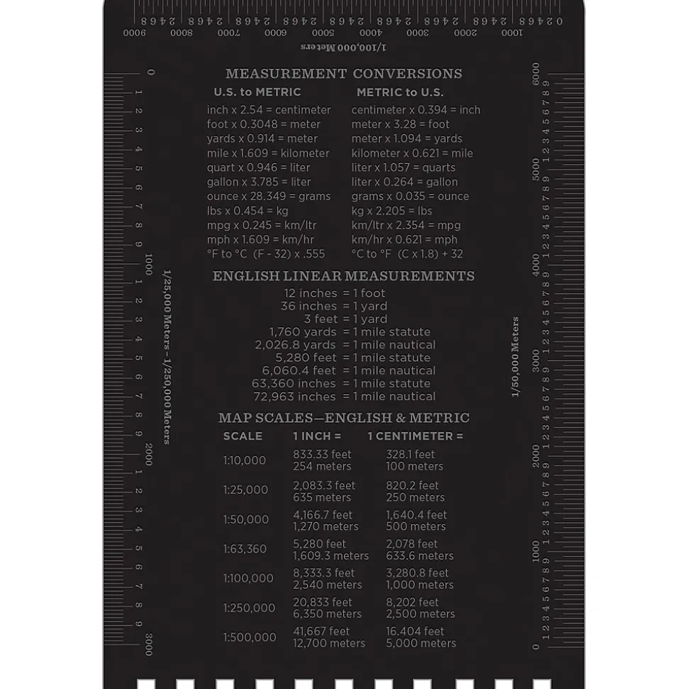 - Rulers, conversion charts, and map scales printed on the cover prove handy in the field