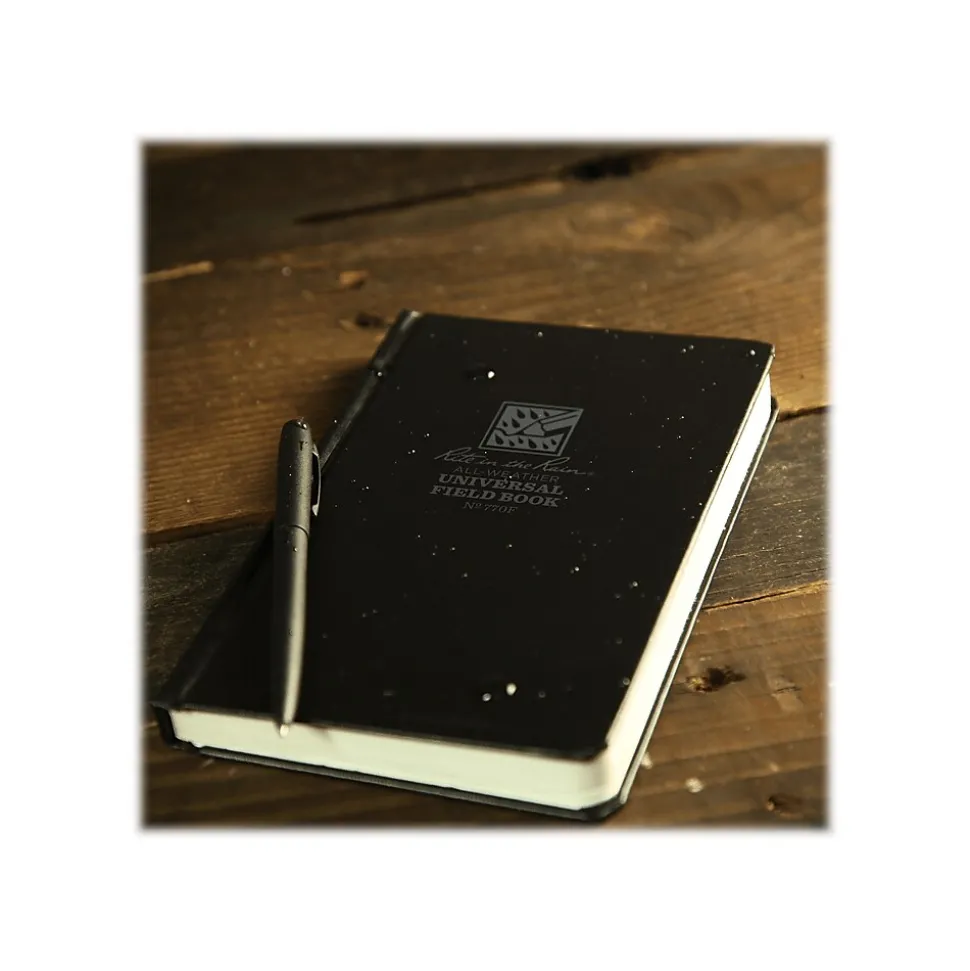 This Rite In The Rain All-Weather Universal 4.75″ x 7.5″ hardbound notebook is discretely sophisticated with its black Fabrikoid cover and subdued light gray tinted paper. Everything from the cover, paper, sewn-in pages, and even glue is designed to survive mother nature’s wrath.