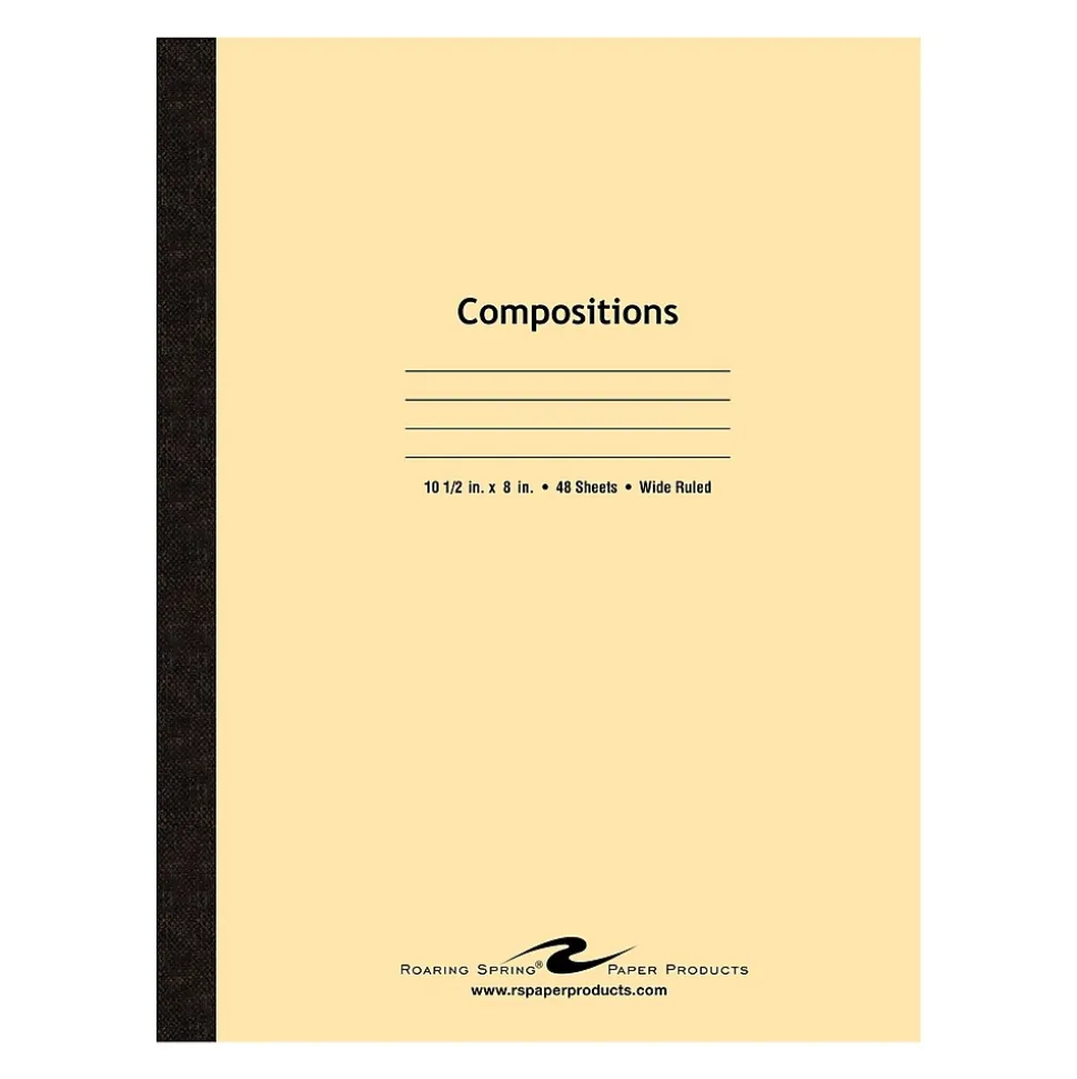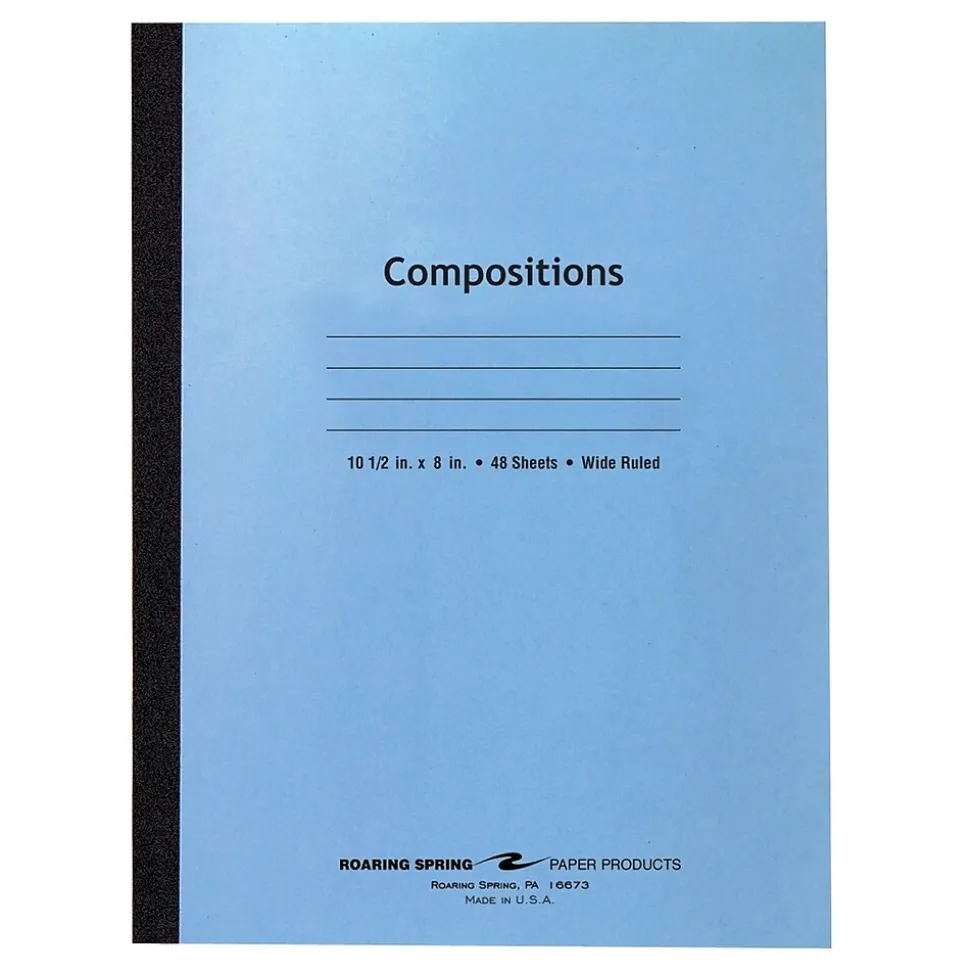 Paper is smooth 15 lb. writing paper with wide ruled blue lines and a red margin line. Covers are a 7 pt. Blue tag/Manila and are flexible to fit easily in backpacks. Each book is produced with center-sewn and tape bound construction, not designed for sheet tear-out. Sheet size is 10.5″ x 8″ and there are 48 sheets/96 pages per book.