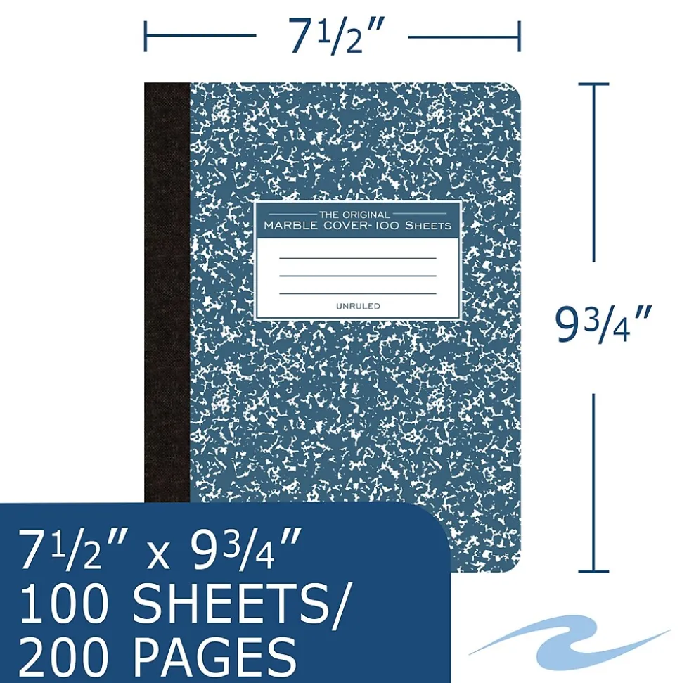 Record your notes in this permanently bound composition book. Paper is smooth 15 lb. writing paper that is plain, with no ruled lines. Great for sketches. Covers are hard whiteboard that is printed in the traditional blue marble pattern. Inside of covers is printed with class schedule and other useful information. Each book is produced with center-sewn and tape-bound construction, not designed for sheet tear-out. The sheet size is 9.75″ x 7.5″ and there are 100 sheets per book. Proudly made in the USA!