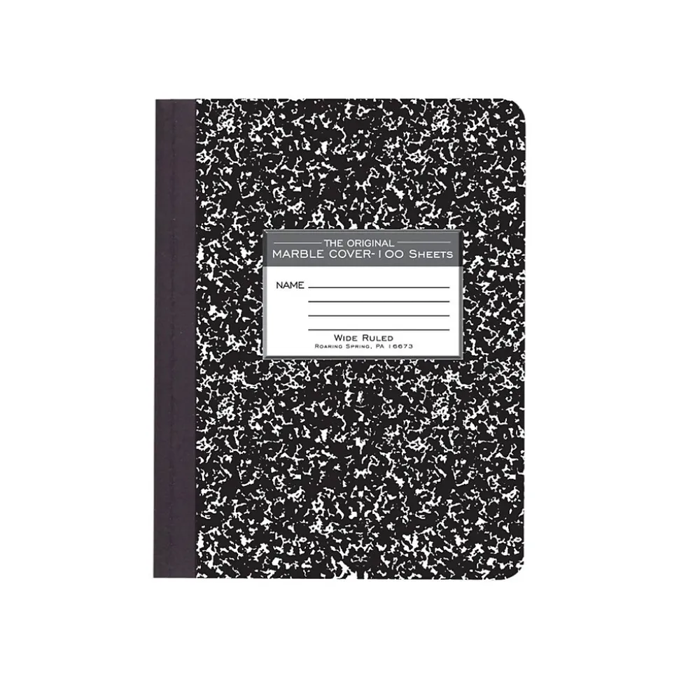 Record your notes in this permanently bound composition book. Paper is smooth 15 lb. writing paper with wide ruled blue lines and a red margin line. Covers are a hard white board that are printed in the traditional black marble pattern. Inside of covers is printed with class schedule and other useful information. Each book is produced with center-sewn and tape bound construction, not designed for sheet tear-out. Sheet size is 9.75″ x 7.5″ and there are 100 sheets per book.