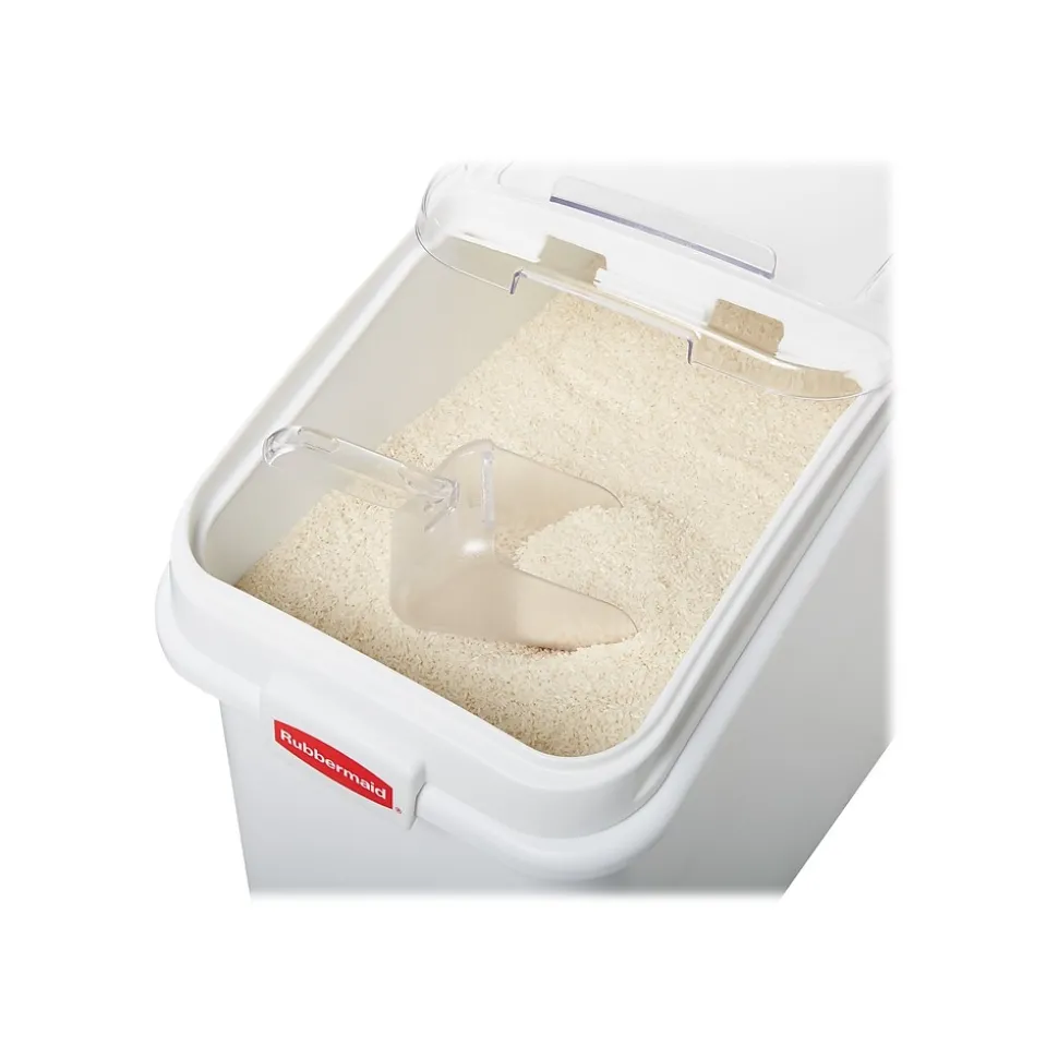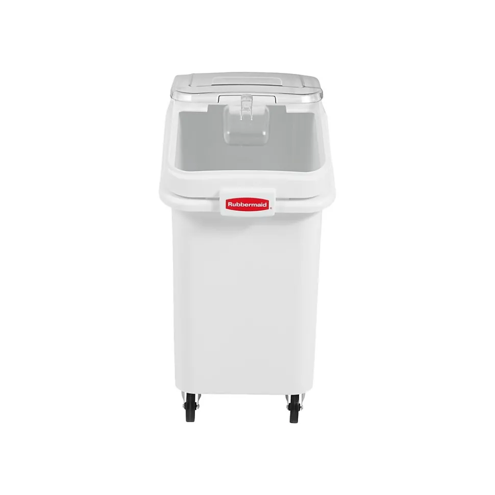 Access flour, sugar and grain quickly with this Rubbermaid ingredient bin. The clear sliding lid on this bin lets employees swiftly identify and fetch recipe elements with one hand, saving time and movement in busy kitchens. The storage bin’s rectangular shape and four casters make it easy to move under prep tables or into storage rooms. This 26.2 gallon Rubbermaid ingredient bin has a built-in scoop storage facility to meet food code regulations.