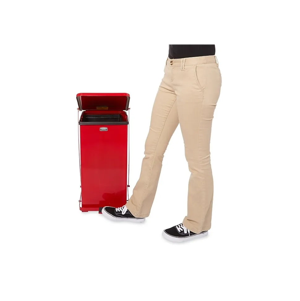 Keep trash contained and out of sight in this trash receptacle. The controlled lid closure reduces noise during use, and its non-slip feet keep the floor protected. This Rubbermaid trash container has smooth surfaces for easy cleaning and a restraint mechanism to protect against wall damage.