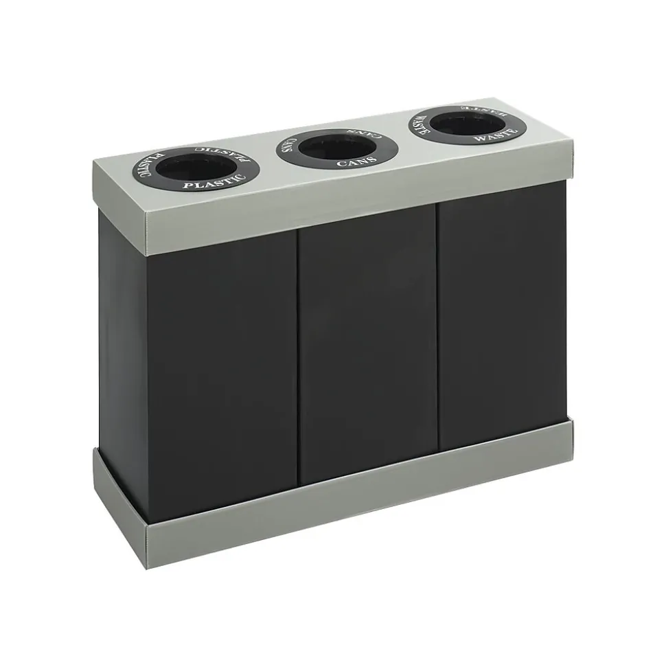 - Use included decals to label openings in a unified lid of this three-compartment trash can