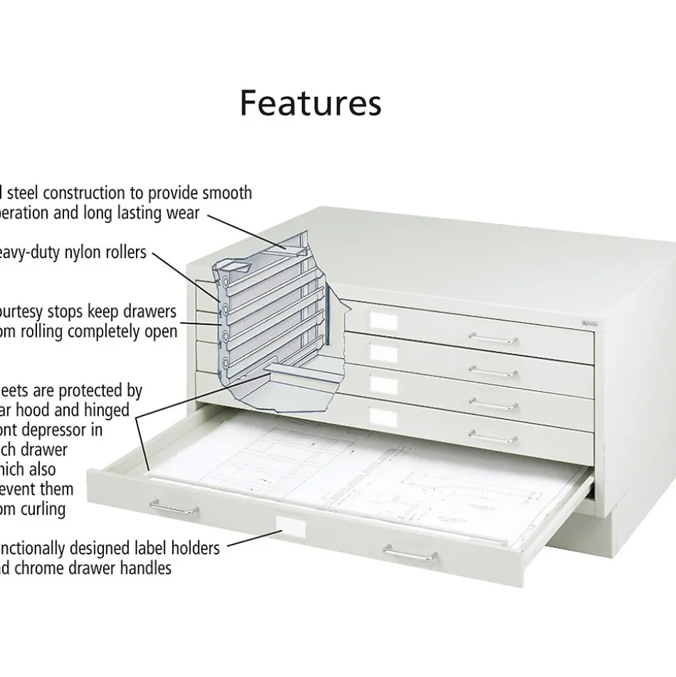 Safco® Small facil steel flat file features simplistic sturdy steel construction with a durable powder coat finish. File is designed with comfortable chrome drawer handles and conveniently placed label holders for customizing your storage needs.