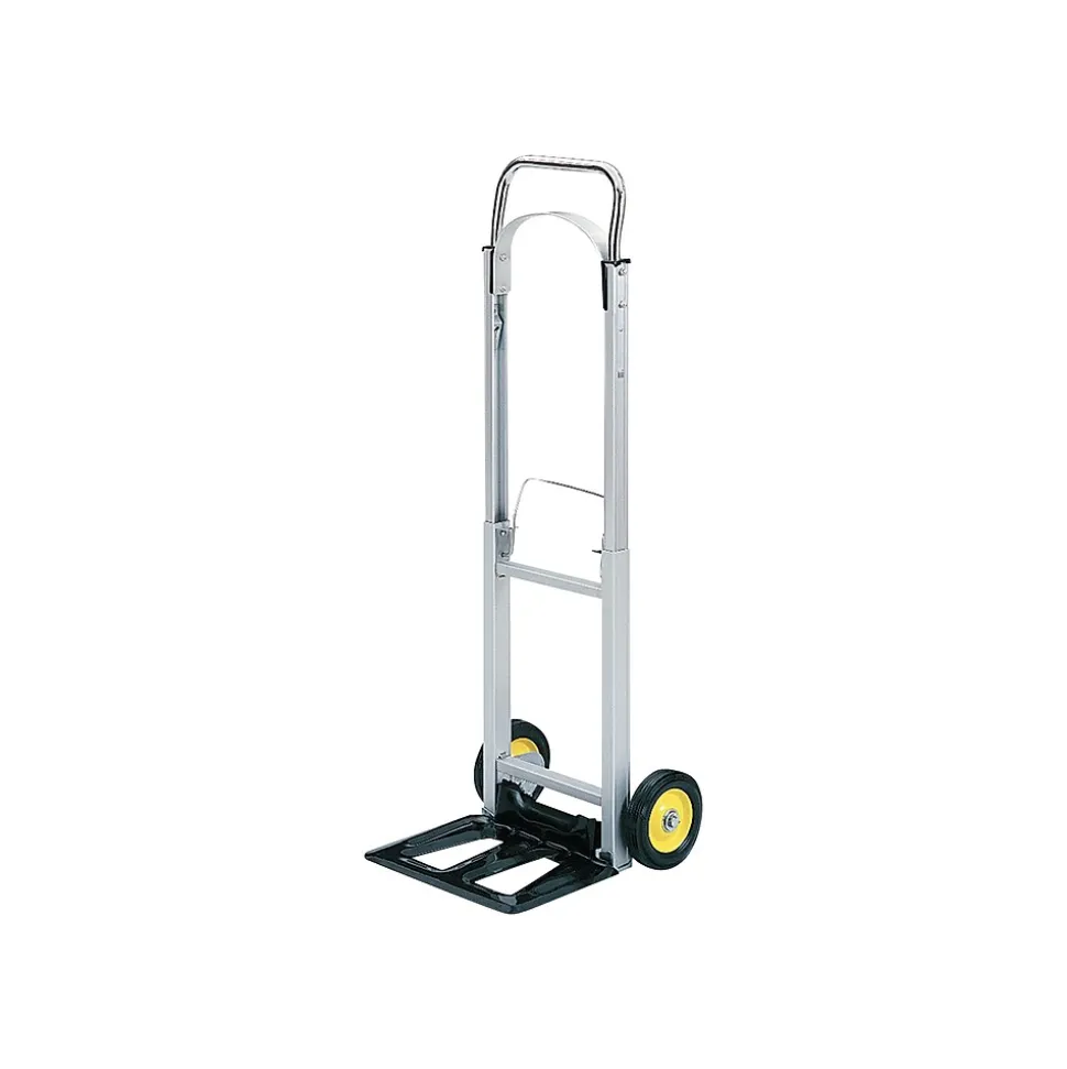 Handle weighty moving jobs with this hand truck, which has a fold-up toe plate that makes it compatible with compact storage spaces. The lightweight aluminum construction makes it easy to pick up, while the durable design lets it carry up to 250 pounds. The handle of this Safco aluminum hand truck adjusts, so people of any height can use it comfortably.