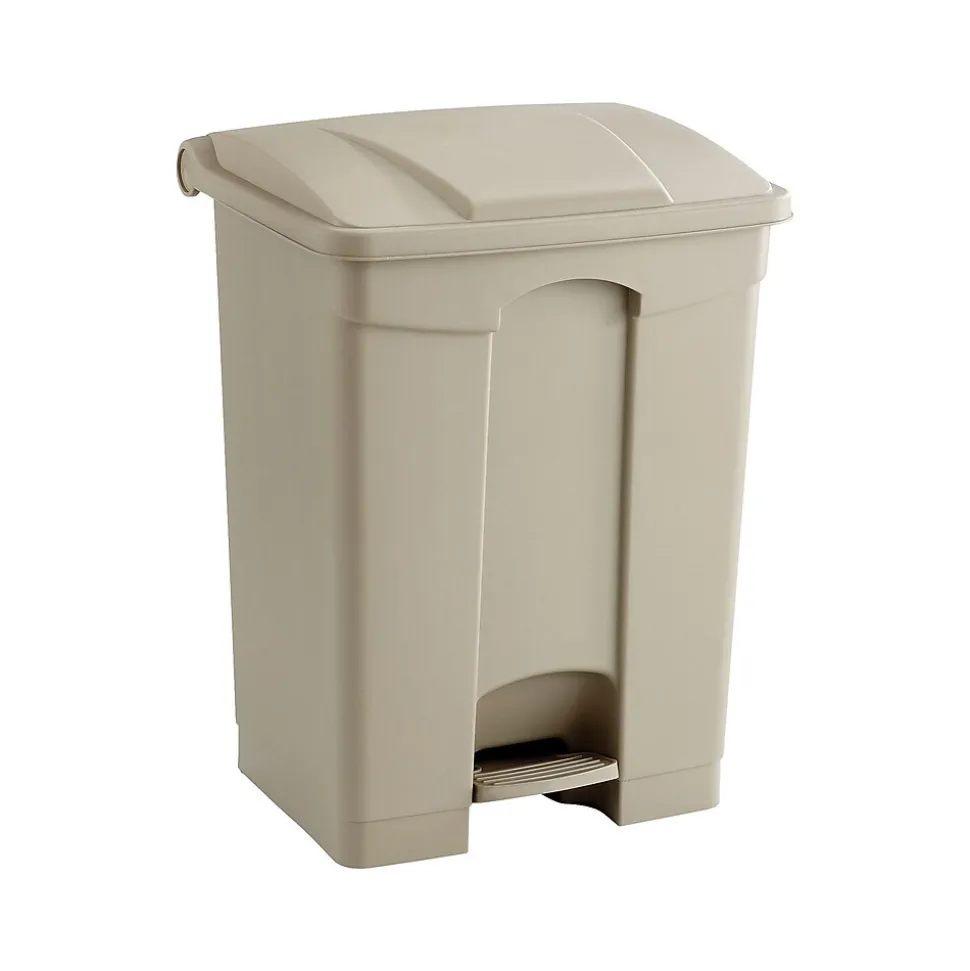 Contain trash with this hinged indoor step trash can. Constructed of tan plastic, this trash can is durable enough to contain even sharp waste. The 17-gallon capacity of this trash can is perfect for common areas with lots of waste. This Safco indoor step trash can is ideal for use in Health Care facilities, cafeterias, and other spaces.