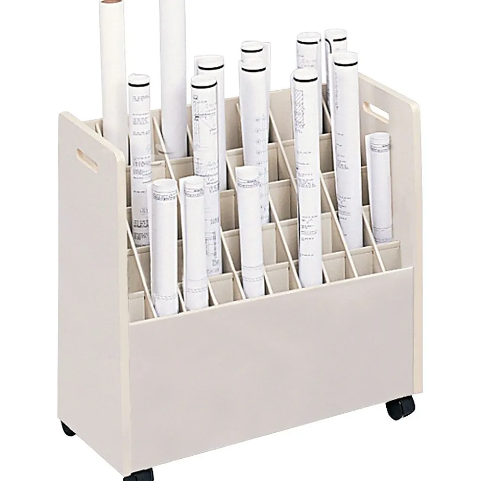 This Safco mobile roll file can hold multiple paper rolls of different lengths, so you can easily organize and categorize your office supplies and finished projects. Mounted on sturdy casters, this unit rolls smoothly from room to room, making roll storage and access more convenient. This file’s grandstand design makes it simple to view rolls and choose the size or type you need, and it includes 50 bins and two drawers so you can maximize office storage space.