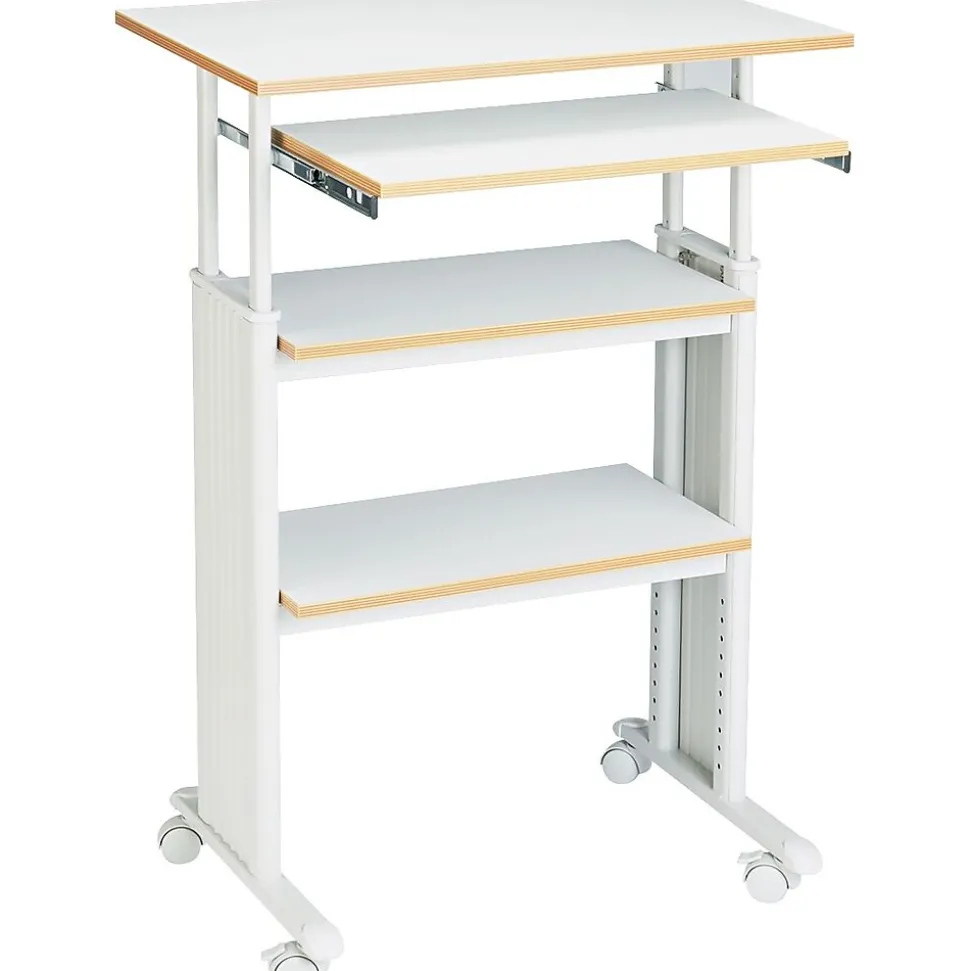 Safco® Stand-up 35″-49″ adjustable height computer workstation in gray color includes a pullout printer and keyboard shelves with PVC on top for durability. Workstation features side panels to hide computer cables for a clean appearance.