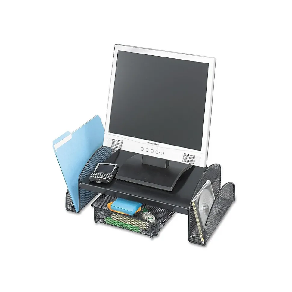 Raise monitors to the optimal viewing height with this stand. Organize supplies and papers in the two side compartments and sliding pullout drawer underneath this stand. This Safco Onyx monitor stand is constructed with heavy-duty steel mesh for quality and durability.