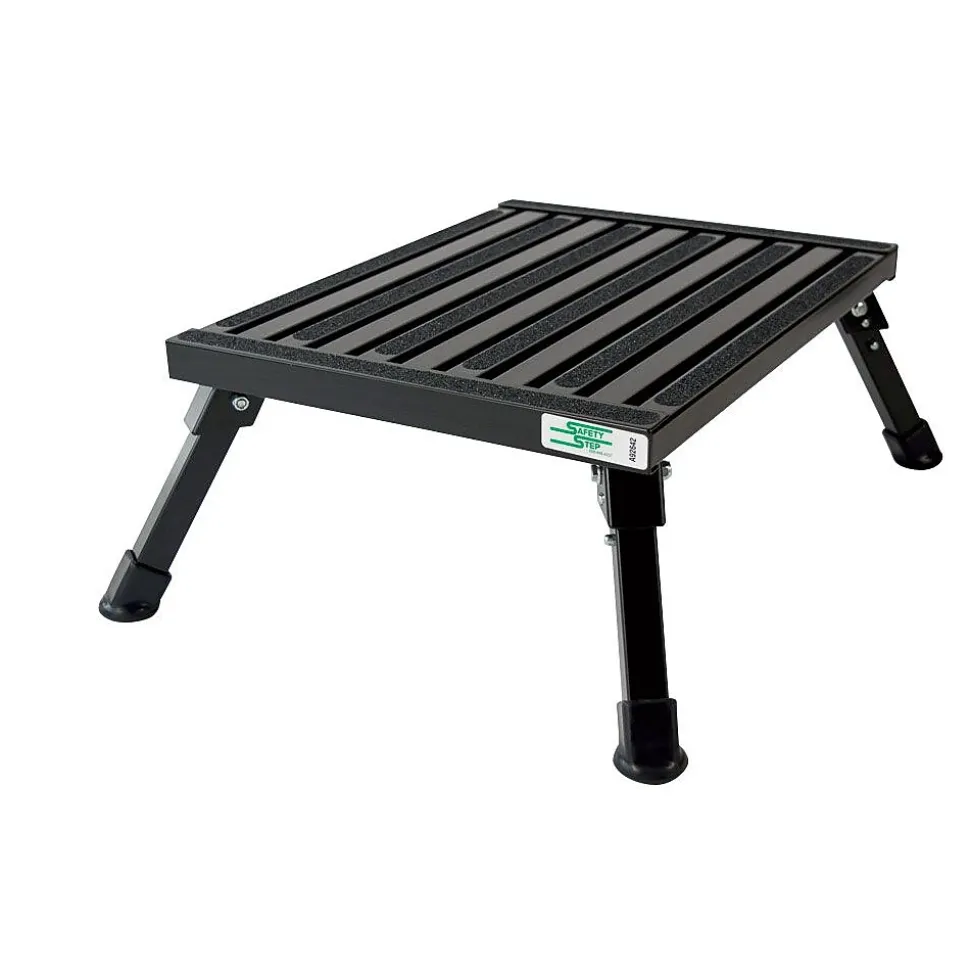 Safety Step features an anti-tip design to prevent the step from toppling over and an anti-slip surface to avoid slipping. Safety Step also has durable steel reinforced rubber feet to prevent the step from sliding. Although, our steps are very robust in appearance, they are actually very light to pick up. The F-08C weighs 8 lbs and features four folding and locking legs for easier storage. The deck size is 15″x19″ and 8″ tall.