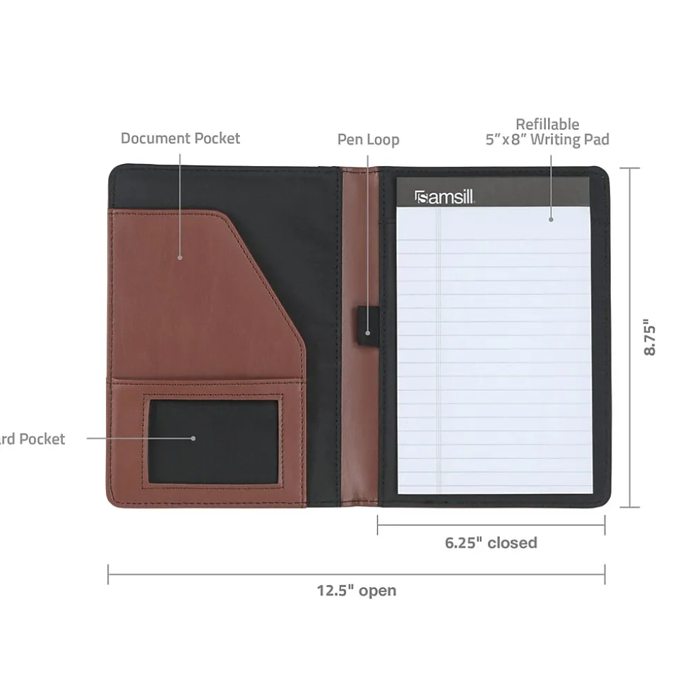 SamsillĀ® tan leather contrast stitch junior padfolio features interior document pocket, business card pocket, pen loop.