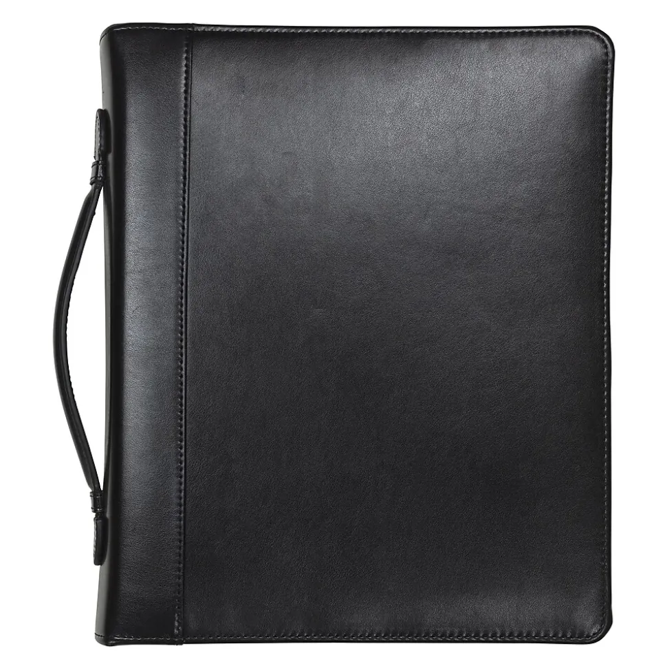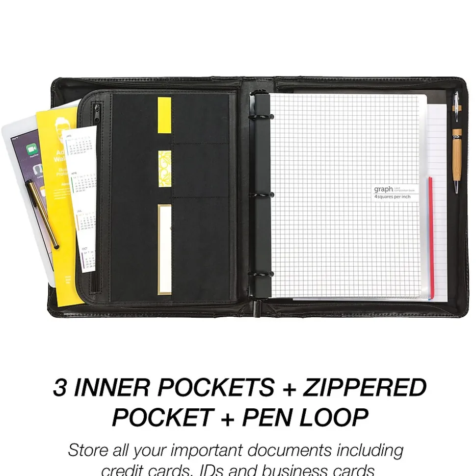 Each executive padfolio with zippered closure gives you the clean yet stylish look with rich black leather exterior and internal lining. Smartly designed for the ultimate in functionality and convenience for both men and women. Includes softly lined tablet sleeve with hook and loop closure that is perfect for 9 inch and 10.1 inch tablets including iPad, iPad Air, Samsill Galaxy, Amazon Fire, Dell Venue, and Google Nexus. Interior is packed with pockets for storing extra documents, business cards, and other business essentials. 1 inch ring binder for organizing documents. Includes letter size 8.5″ x 11″ writing pad that adapts for left handed and right handed use. Pen loop. Perfect zipper pad holder ring binder any professional wanting to look the part.