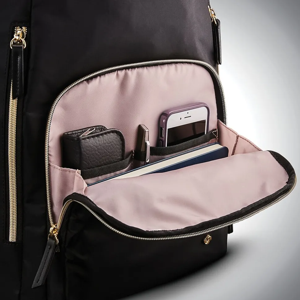 This Samsonite laptop backpack is made of water-resistant nylon material and features a padded laptop compartment and a tablet pocket. It also has a front organizer pocket, a side water bottle pocket, and a smart strap.