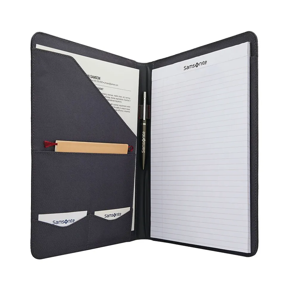 Access pens, notebooks, and other accessories quickly with this business padfolio. The built-in cardholders make it simple to keep a business card on hand, while the convenient interior pocket keeps loose pages secure and partially visible. This Samsonite Xenon Business padfolio comes in steel gray and is made from ballistic fabric, producing a high-quality look and feel.