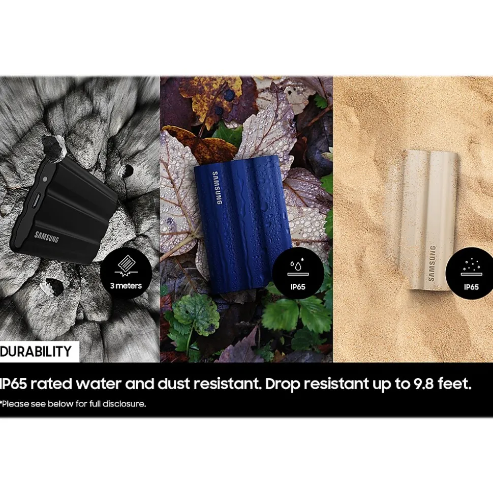 Tough, fast, and compact. The rugged T7 Shield SSD is built to endure with the space to create, thanks to an IP65 rating for dust and water resistance. Transfer massive files in seconds: USB 3.2 Gen 2 and PCIe NVMe achieve soaring sequential read and write speeds up to 1050MB/s and 1000MB/s, respectively, allowing you to edit directly from the drive. The high-tech rubber exterior with Dynamic Thermal Guard controls heat to maintain steady performance for even giant projects. Ready for the rough and tumble: shoot on location and wander the wild while feeling confident your data is securely protected from water and dust with the IP65 rating. The rugged design and advanced outer elastomer add extra durability to even endure a 9.8′ drop. The T7 Shield is compatible with Windows, macOS, and Android devices, gaming consoles, and more. Included in the box are USB Type-C to USB Type-C and USB Type-C USB Type-A cables for added convenience. A 2TB capacity gives you colossal space in a sleek colorway. The stylish rubberized grip prevents slips, so the SSD stays in your hands. Bring everything with you, and look great doing it. Experience the outstanding performance and reliability you expect from Samsung: all firmware and components, including Samsung’s world-renowned DRAM and NAND, are produced in-house, allowing end-to-end integration for quality you can trust.