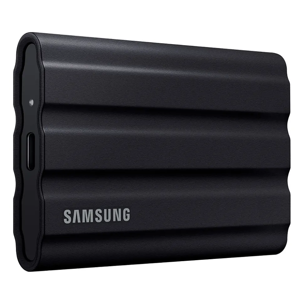 Tough, fast, and compact. The rugged portable Samsung T7 Shield is built to endure with the space to create thanks to an IP65 rating for dust and water resistance. Transfer massive files in seconds. USB 3.2 Gen 2 and PCIe NVMe achieve soaring sequential read/write speeds of up to 1050/1000 MB/s, allowing you to edit directly from the drive. The high-tech rubber exterior with Dynamic Thermal Guard controls heat to maintain steady performance for even giant projects. The T7 Shield is compatible with PC, Mac, Android devices, gaming consoles, and more.