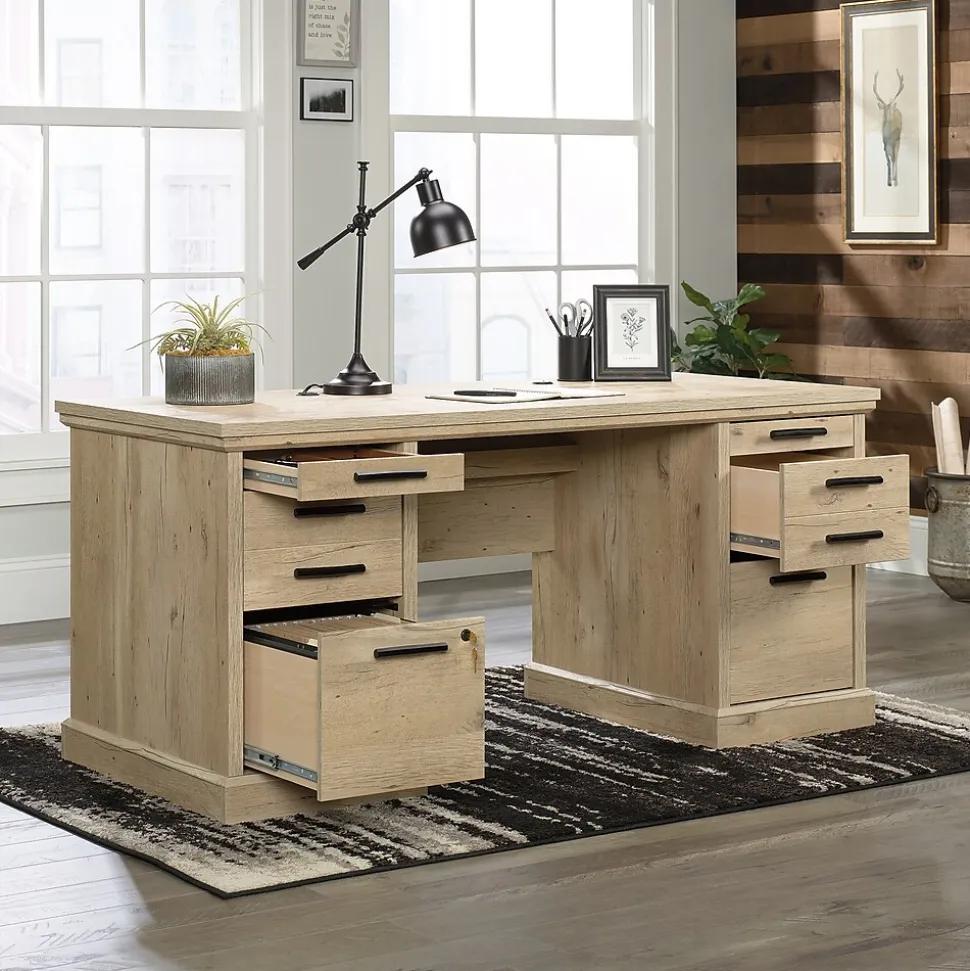 Desks have become an essential addition to the home. With the executive computer desk from the Aspen Post collection, style and function are combined into one grand desk. The top of this home office desk features strong and lightweight 1 panel construction so you can trust it to support your books, while also being light enough to easily rearrange your home office. This computer desk with drawers features two smaller pencil drawers and two medium size storage drawers to hold spare paper, pencils, binders and more. Two lower file drawers with full extension slides hold letter, legal or European size hanging files so your most important documents are organized and easily available. The left file drawer also features a lock for security and peace of mind. This executive desk with storage features a cord management system with two desk top grommet holes to keep your cords tidy and out of sight. To enhance your home office, this desk also accommodates optional Hidden Wireless Qi Charger by Eggtronics 425905 (sold separatelyvisit sauder.com for more information). Featuring quick and easy assembly with patented T-lock drawer system, assembly and set up of this item will be a breeze. Finished in a light Prime Oak, this wood home office desk adds the ideal amount of stateliness and function to create the ultimate home office.