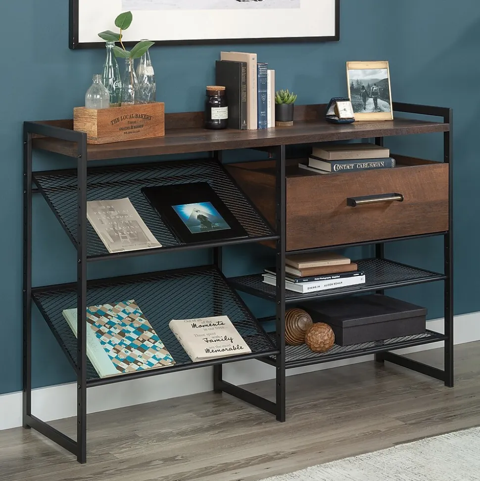 A unique bookcase for your unique needs. This bookcase with drawer from the Briarbrook collection is the distinctive element your home has been missing. This bookcase with storage features a drawer with metal runners and safety stops that can hold a variety of items: office supplies, writing materials, and general storage. The top surface of this display bookcase features a cornered edge for displaying home decor and photos of your family. This bookshelf with drawer features shelves that can be tilted for displaying books, magazines, artwork, and photos. A highly configurable design allows for customizable placement of shelves and drawer, all according to your personal preference. This bookcase with shelves is finished on all sides for versatile placementit will look polished and complete from every angle. Finished in Barrel Oak with powder coated metal shelves and frame, this modern bookshelf will catch the eye of guests, and make you proud of your purchase.