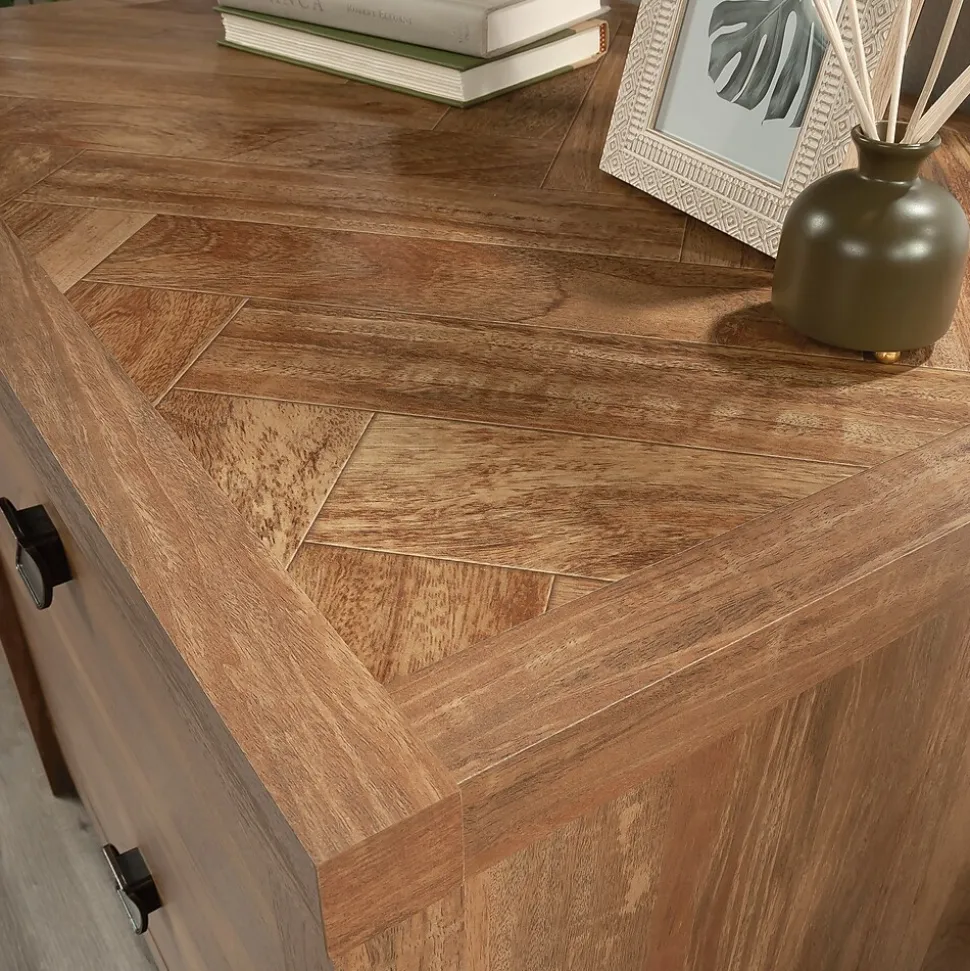 A lovely addition to your home office is just a click away with this lateral file from the Cannery Bridge collection. This 2-drawer lateral file cabinet features large drawers with full extension slides that hold letter or legal-size hanging files. Both drawers of this lateral filing cabinet lock for secure storage of your important documents. The interlocking safety mechanism allows only one drawer to open at a time for extra safety measures. The spacious top surface of this wood lateral file cabinet provides space to store and display items like a wireless speaker, stacks of magazines, decorative plants, and photos of your family and friends. A herringbone pattern detail on the top surface creates a visually stunning centerpiece to any room. This legal-size filing cabinet is finished on all sides, so it will look polished from every angle. Finished in Sindoori Mango and detailed with attractive hardware, this 2-drawer file cabinet is the storage solution your home needs.